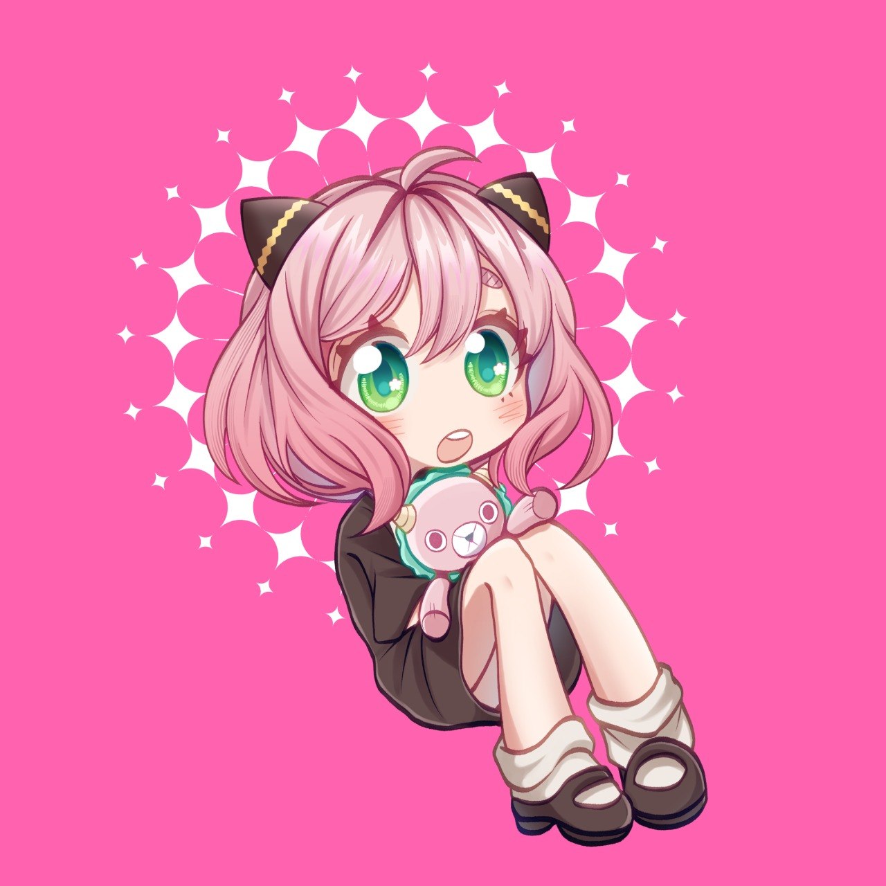 Рисунок персонажа из аниме "семья шпиона". Ребёнок с игрушкой в руках удивляется тому, что видит перед собой