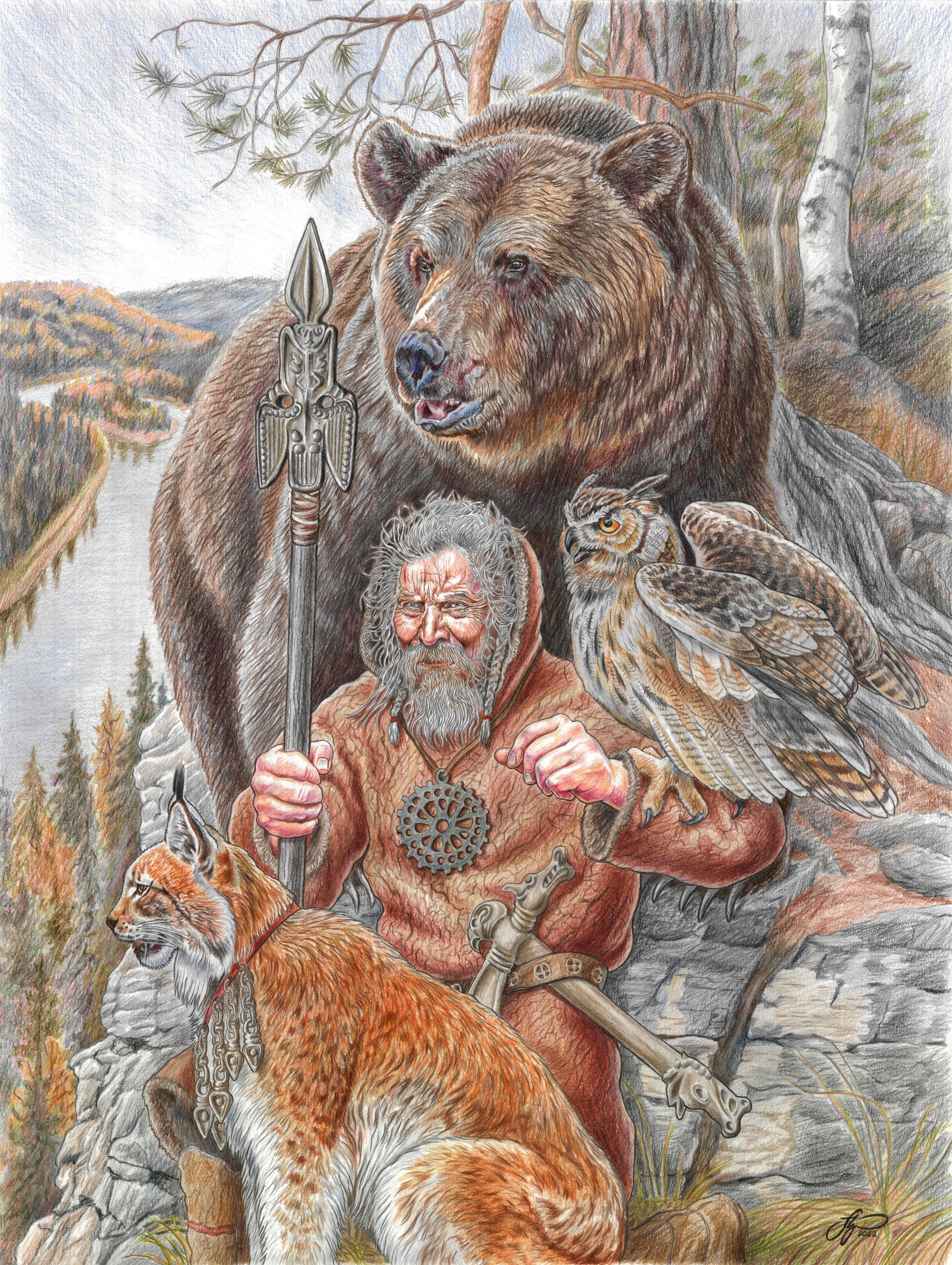 Размер изображения 650х480 мм. В раме. Славянсая и финно-угорская мифология. Медведь (Ош) - один из ключевых персонажей в мифологии финно-угров в целом и народов коми в частности. Рысь у древних славян считалась «оберегом своей земли», причем оберегом всей Руси. Филин — ночной хищник и, следовательно, связан с духами нижнего (мертвого) мира, но с другой стороны он может выступать верным помощником и нередко является родовым тотемом.
