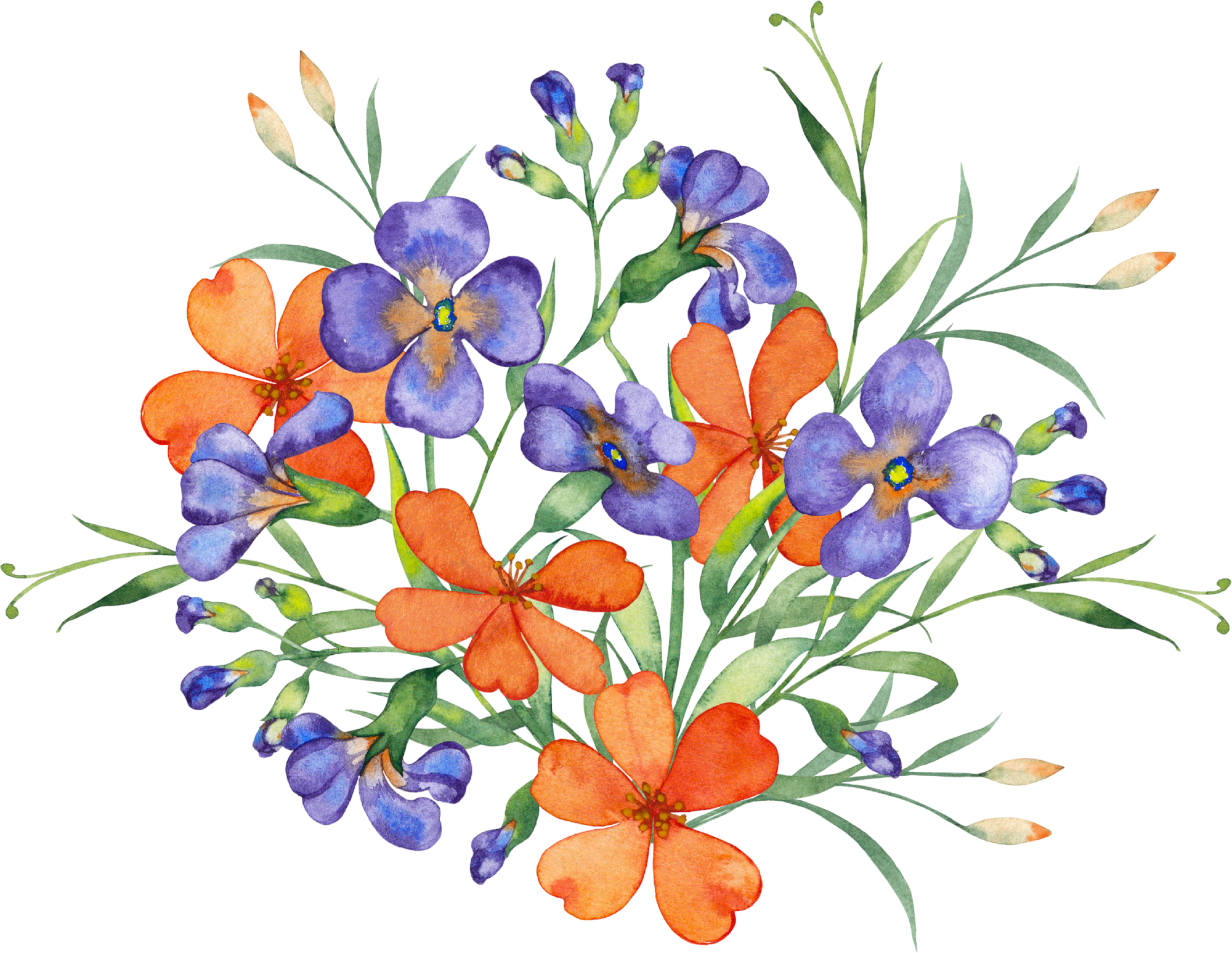 Нежный букет полевых цветов в фиолетовых и оранжевых тонах. Нарисованная вручную акварель. Цифровой файл для печати .png