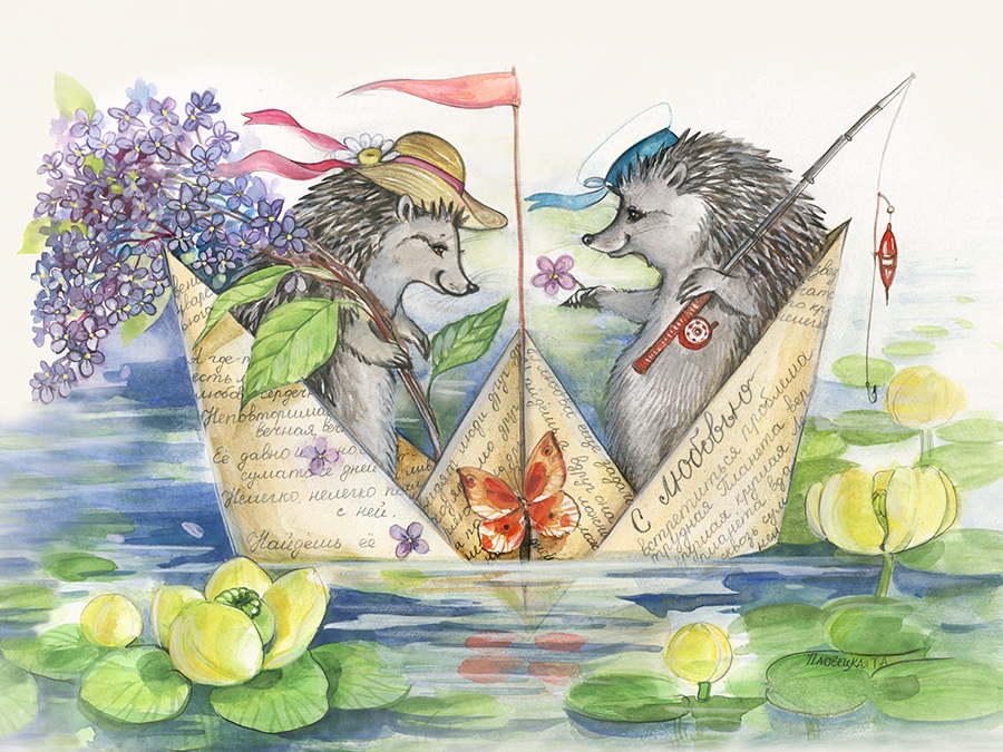 Ежики плывут на бумажном кораблике.
