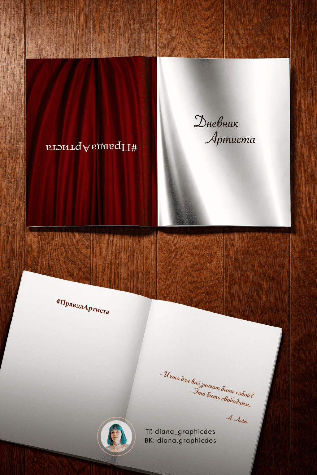 Дневник двусторонний: первый разворот обложки - зеркальный, а второй перевернутый с фоном занавесов. Создан такой в пользу удобства заполнения его с двух сторон