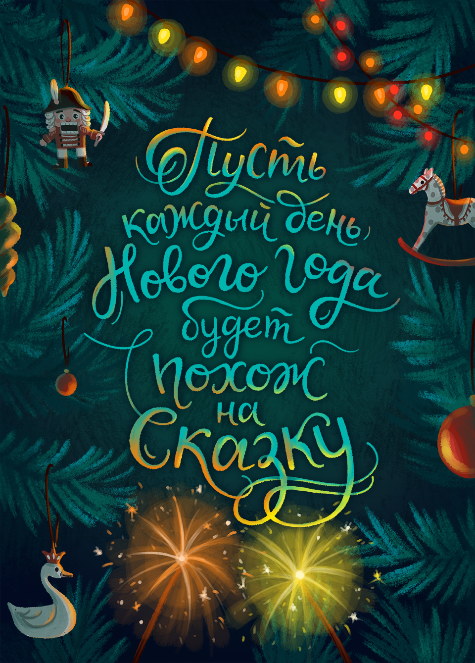 Иллюстрация с новогодними пожеланиями для открыток, календарей и другой продукции. Персональный проект.