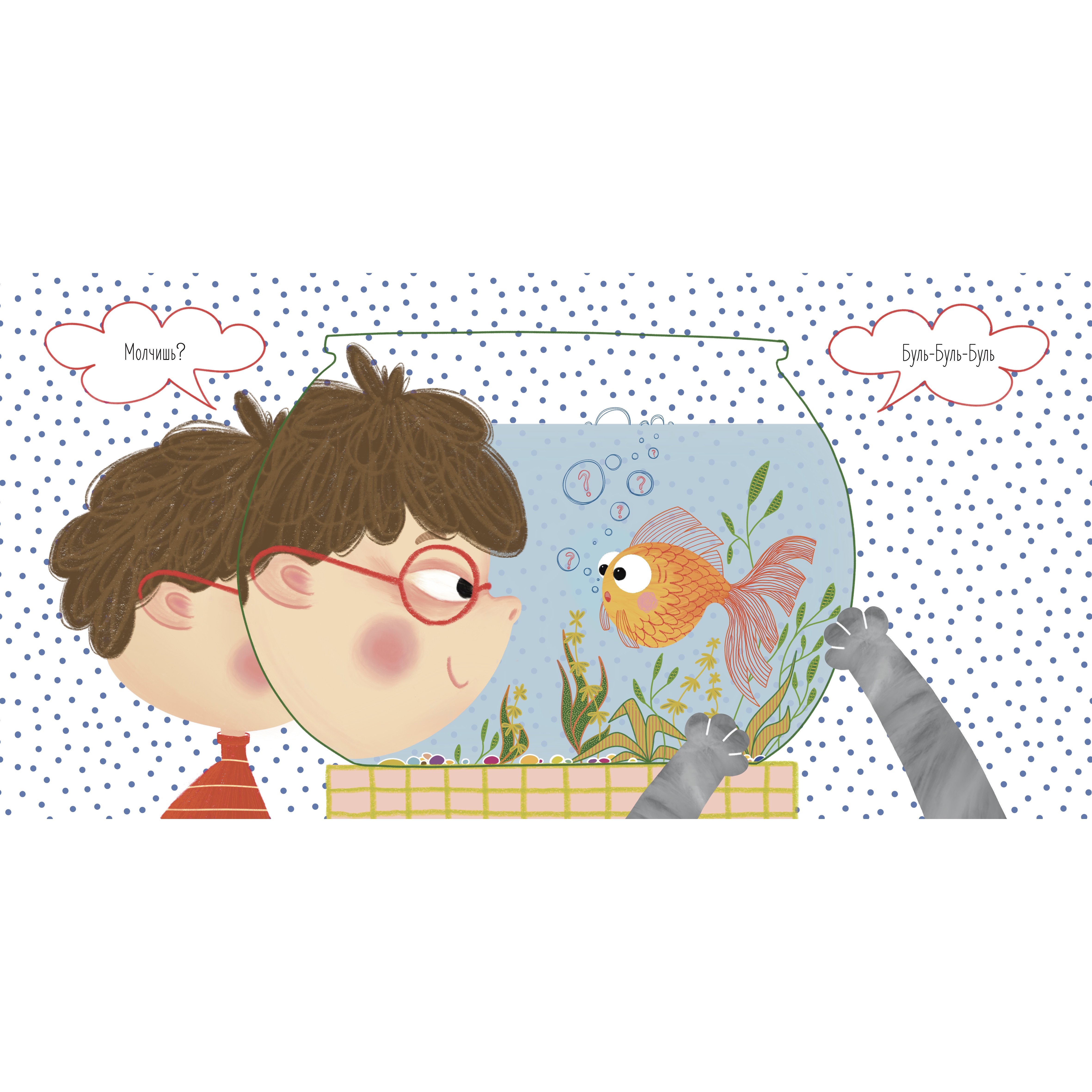 Разворот книги «Дело о пропавшем носке». Допрос рыбки, которая явно не в курсе происходящего.