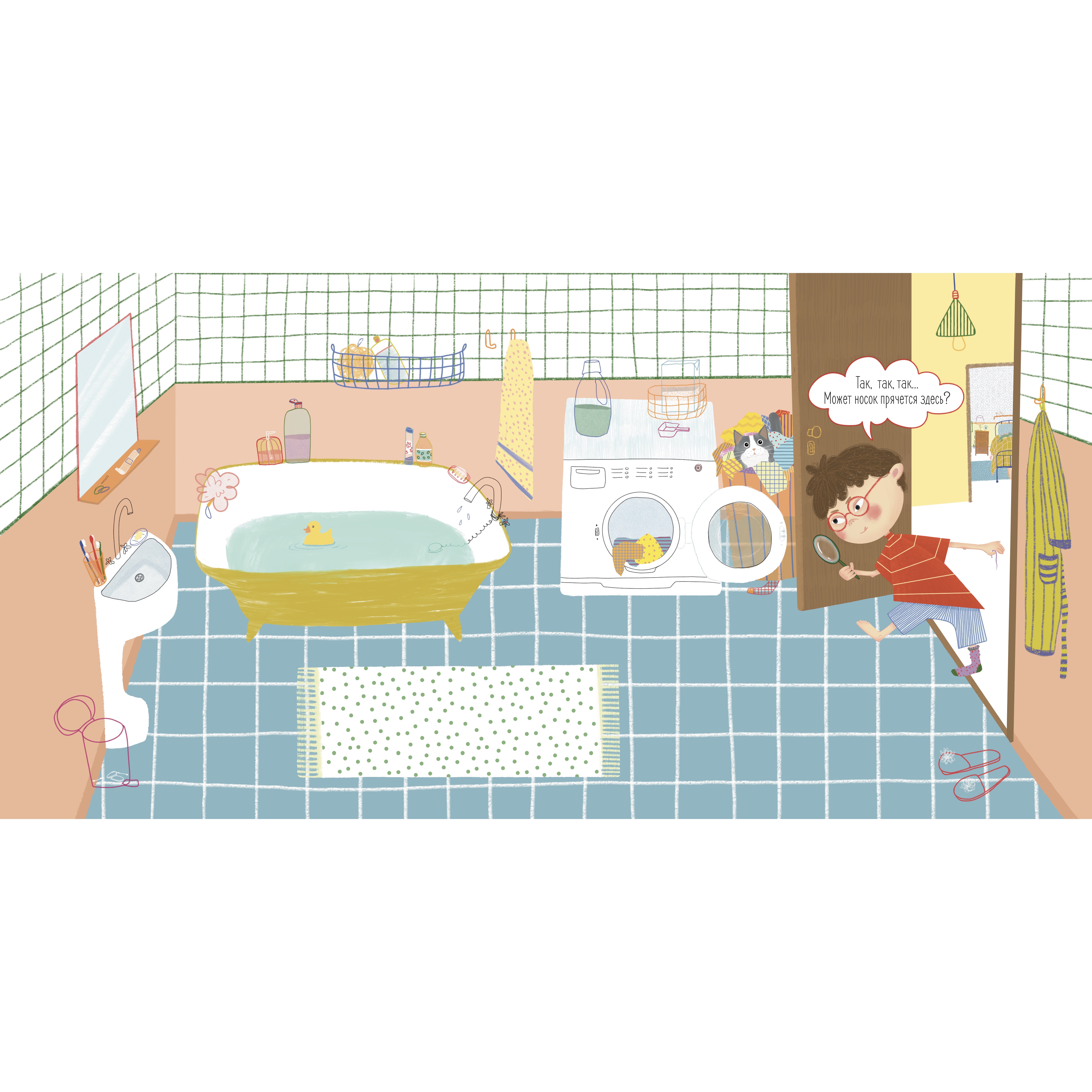 Разворот книги «Дело о пропавшем носке». Поиски приводят героя в ванную, где он проверяет каждый угол