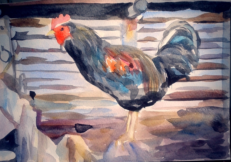 Ну это самая первая работа акварелью спустя 5 лет после окончания художественной школы. Тогда там все рисовалось по наказанию, без удовольствия, без даже осмысления процесса. Теперь же захотелось опробывать новенькие акварельные и изобразить что-то интересное, яркое, вот и петух этот был срисован с фотографии)