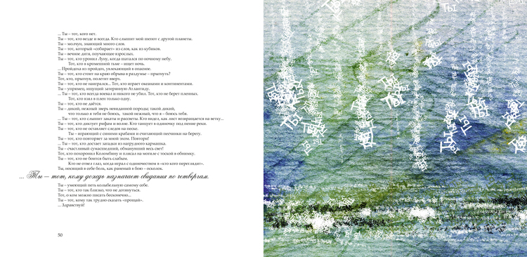 Ты — тот, кто не оставляет следов на песке. Ты — играющий с синими крабами и считающий песчинки на берегу. Ты — тот, кто повторяет за мной эхом. Повтори!