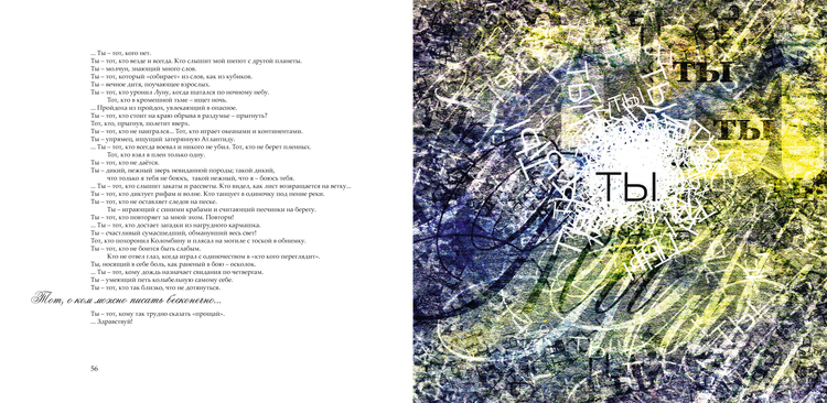 Ты — тот, кто не оставляет следов на песке. Ты — играющий с синими крабами и считающий песчинки на берегу. Ты — тот, кто повторяет за мной эхом. Повтори!