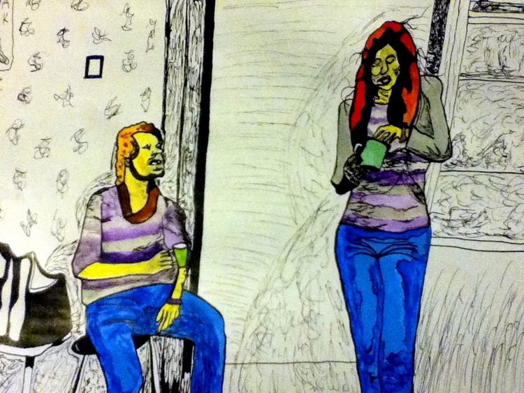 Выполнено на бумаге формата А4. Тушь, перо и акрил. краски.