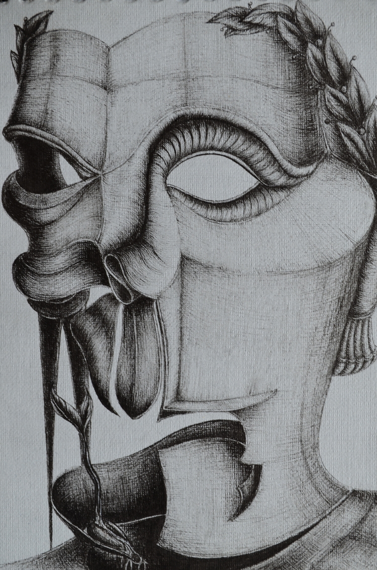 Железная маска Цезаря-лжеца полая внутри. Сквозь нее пробивается маленький росток.