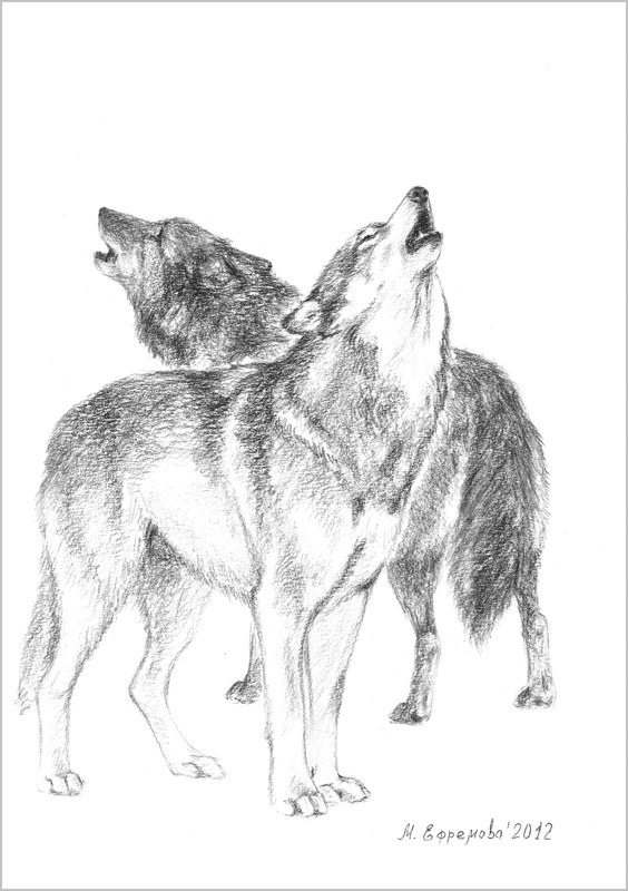 Воющие волки. Рисунок углем.