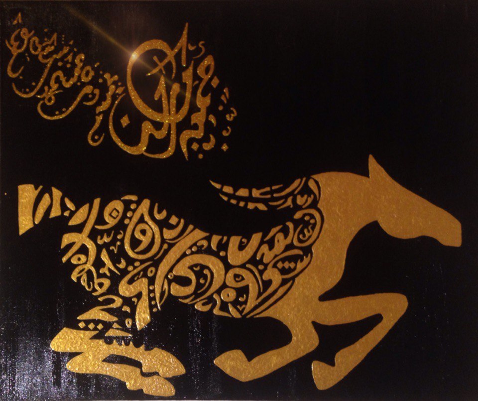 Картина выполнена на холсте с использованием качественных акриловых красок и золотого контура. Надпись на арабском языке дополнительно покрыта золотыми блёстками, что придаёт картине завораживающее сияние и блеск.