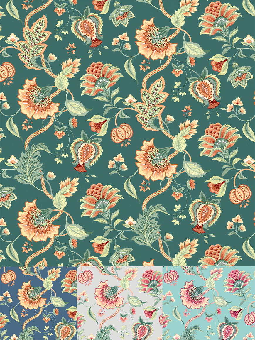 Вертикально направленный текстильный или обойный рисунок, с мотивами сказочных цветов и лиан. Рисунок раппортный (бесшовный).Возможны другие колористики.