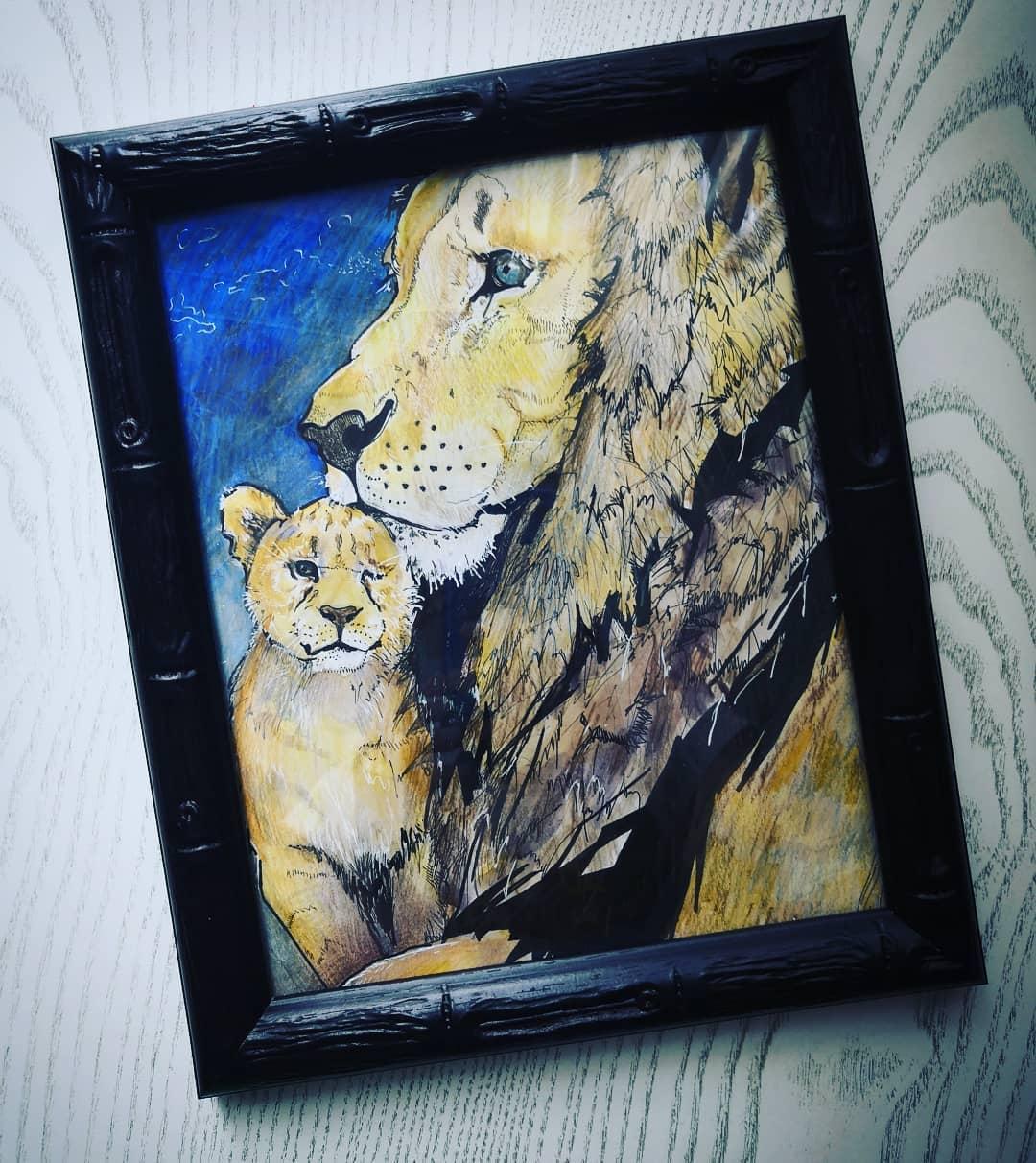 Изображение льва со львенком. Называется "Папа рядом". Оформлено в рамку. Материалы: линеры, цветные крандаши и маркеры. Размер 25х20 см....