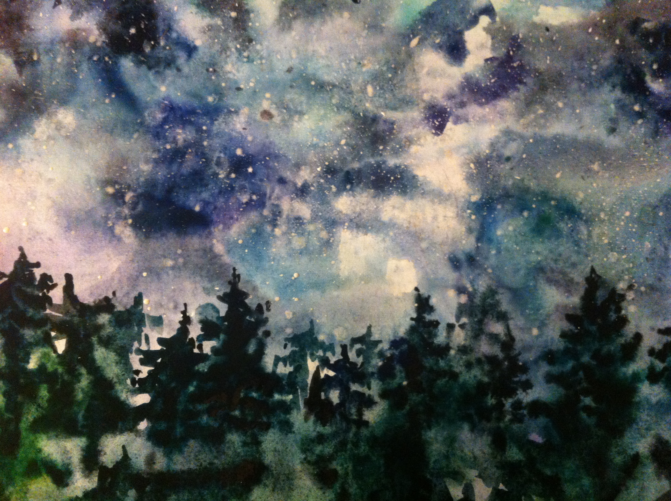 Изображение сияющего ночного леса, холодного неба. Кто-то видит северное сияние,кто-то волшебство звезд, неба,ночи. Главное наблюдать, фантазировать,мечтать, видеть то,чего не видят другие.