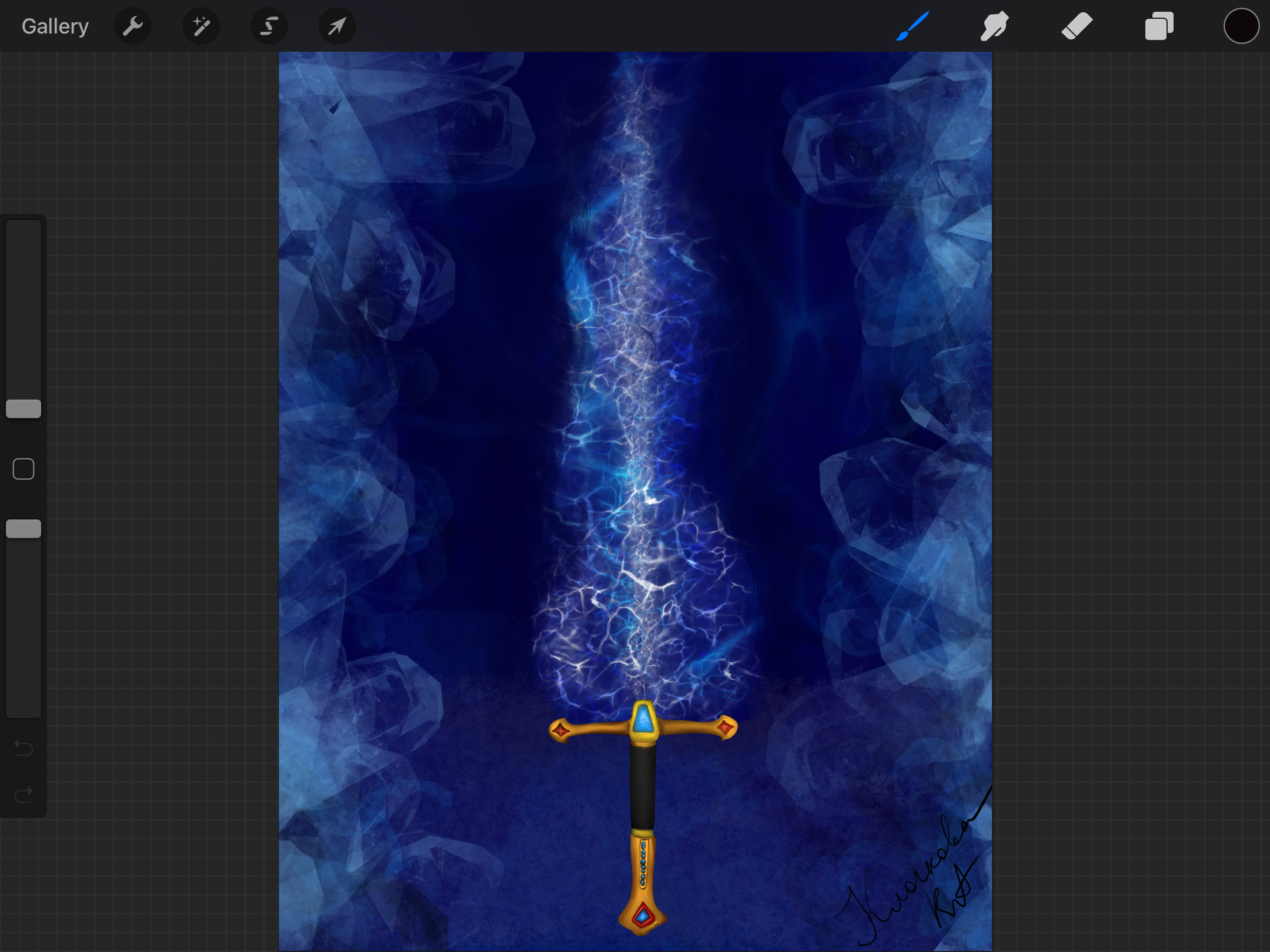 Иллюстрация водяного меча судьбы к трилогии Сергея Саидова «Рыцарь Ордена». Одна из первых работ в Procreate. Меч имитирует шеркон - меч главного героя.