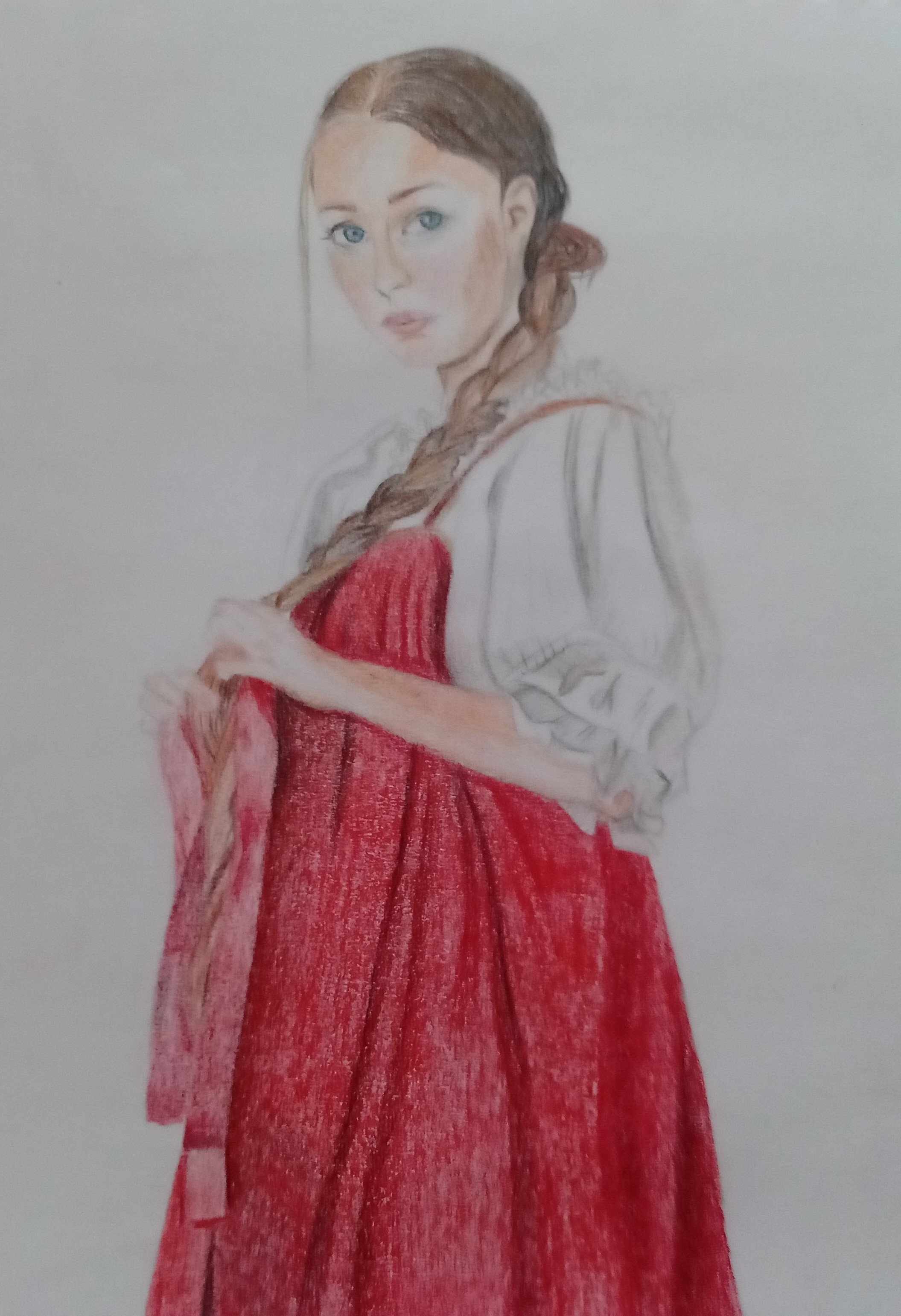 Работа выполнена цветными карандашами на белом твердом альбомном листе.Очаровательная деревенская девушка вплетает красную ленту в свою косу.