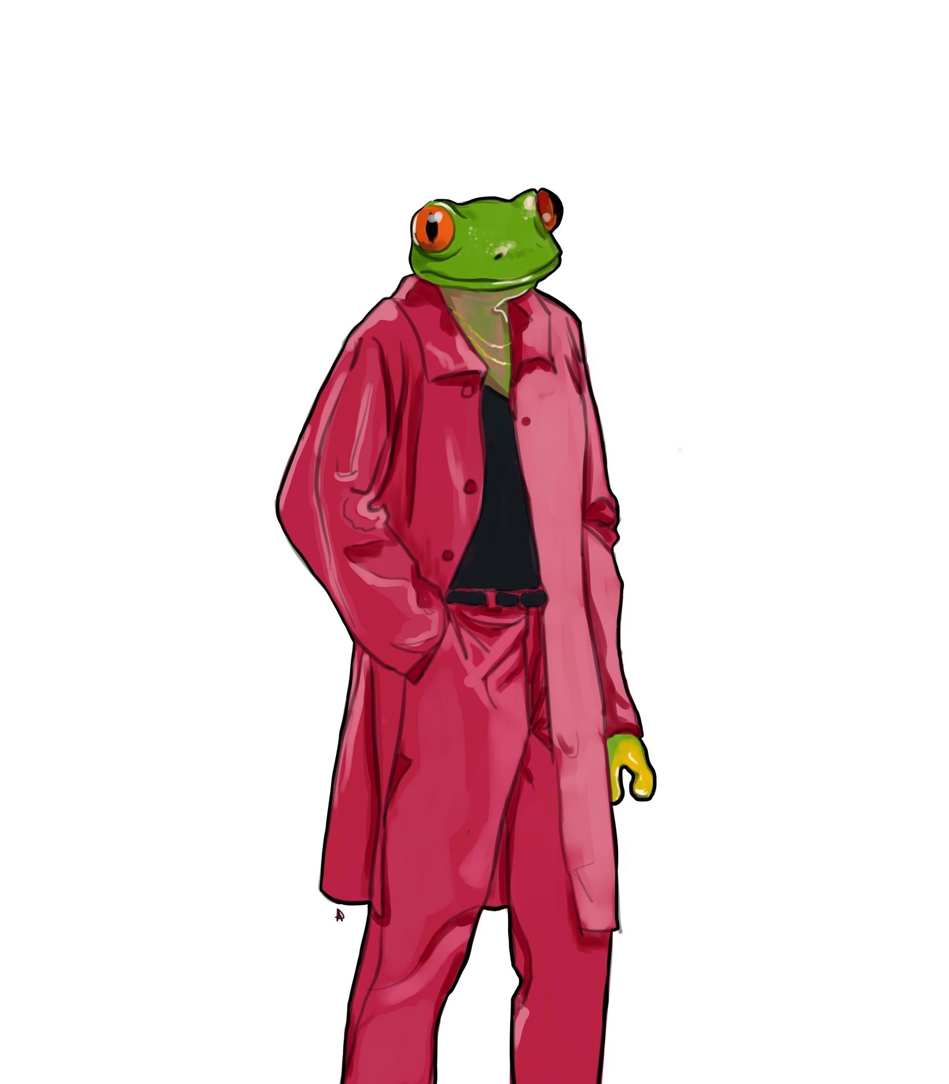 Экзотическая зеленая лягушка с оранжевыми глазами и улыбкой, в большом мужском розовом костюме, черной майке и цепочками в 2/3 чуть ниже колен.