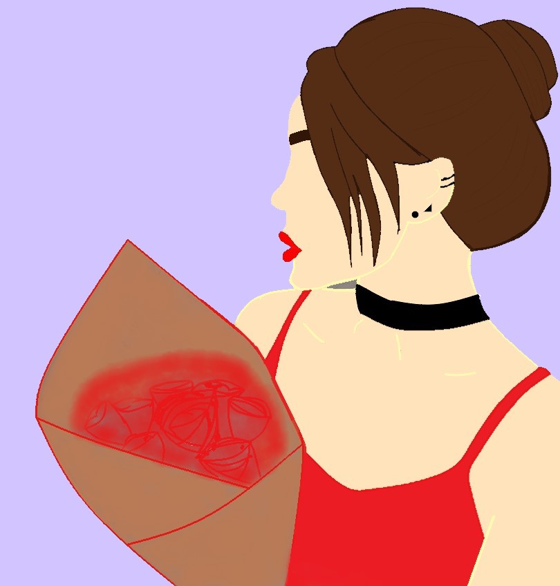 Могу снизить цену на любую картину, т.к. еще набираюсь опыта. Девушка с красными розами и губами. Каштановый пучок волос на голове. Уни проколаты в нескольких местах.
