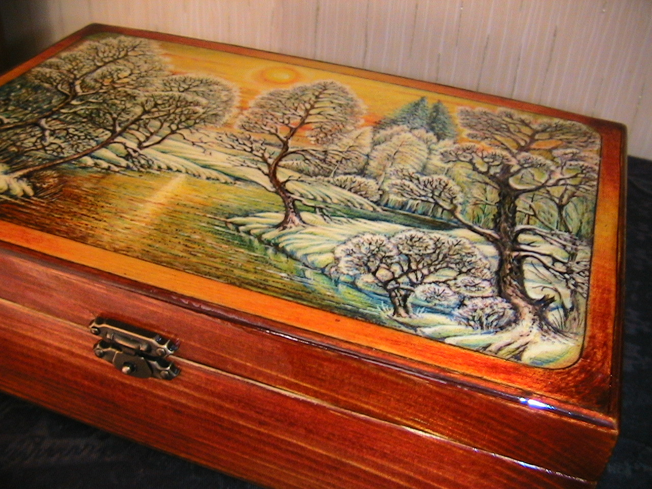 Шкатулка из массива сосны. Тонировка под красное дерево. Ручная роспись. Покрыто тремя слоями лака. Размер 26 х 16 х 8 см. Фурнитура под бронзу.