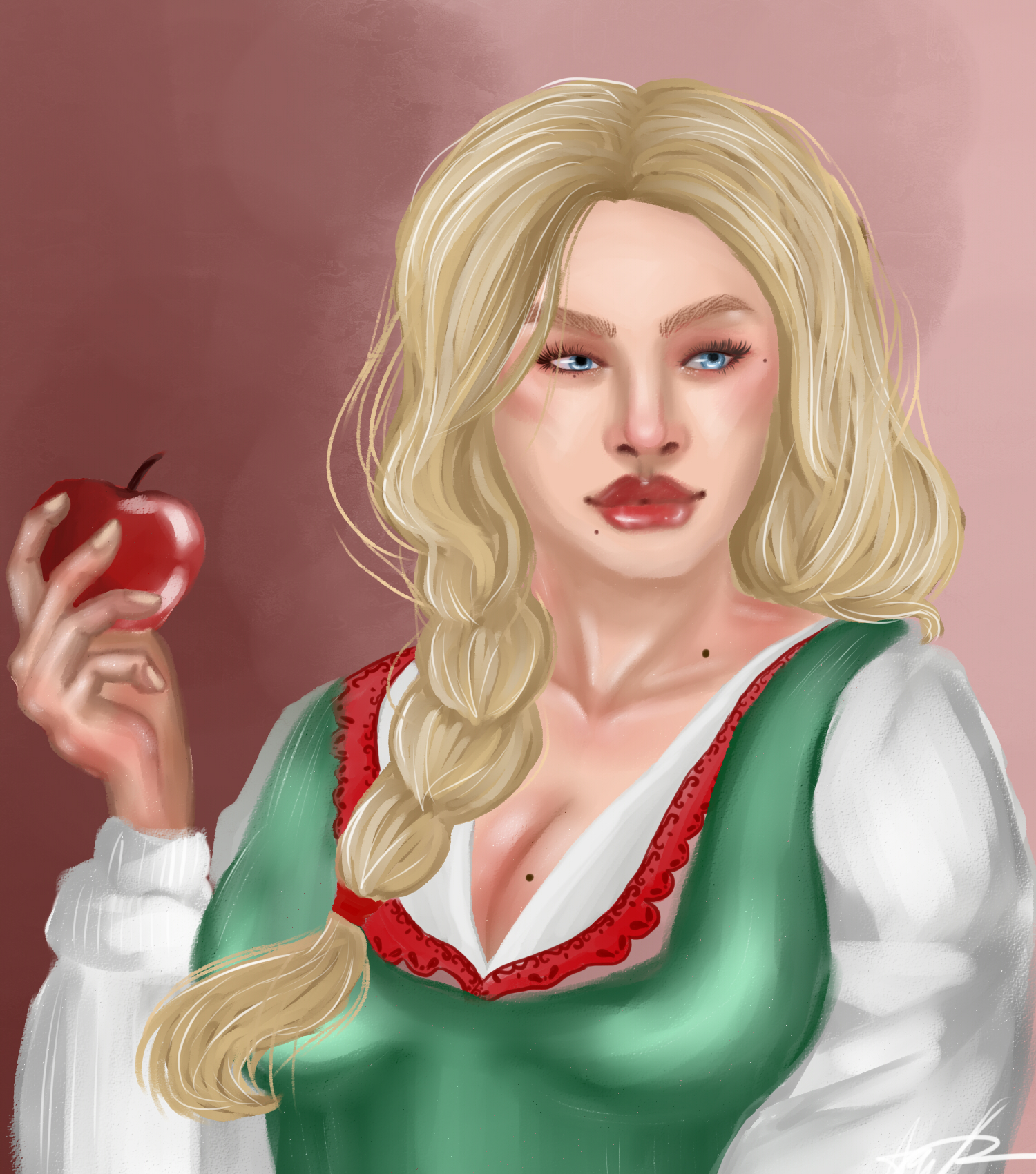 Графическое изображение русской девицы с яблоком, выполнена на графическом планшете. В данной работе хотелось передать классический стиль написания таких работ, а так же настроение того времени
