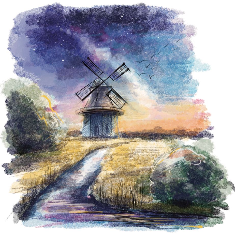 Иллюстрация "Мельница", в большом разрешении. Может быть использована как принт на различных поверхностях, так и как постер для интерьера.