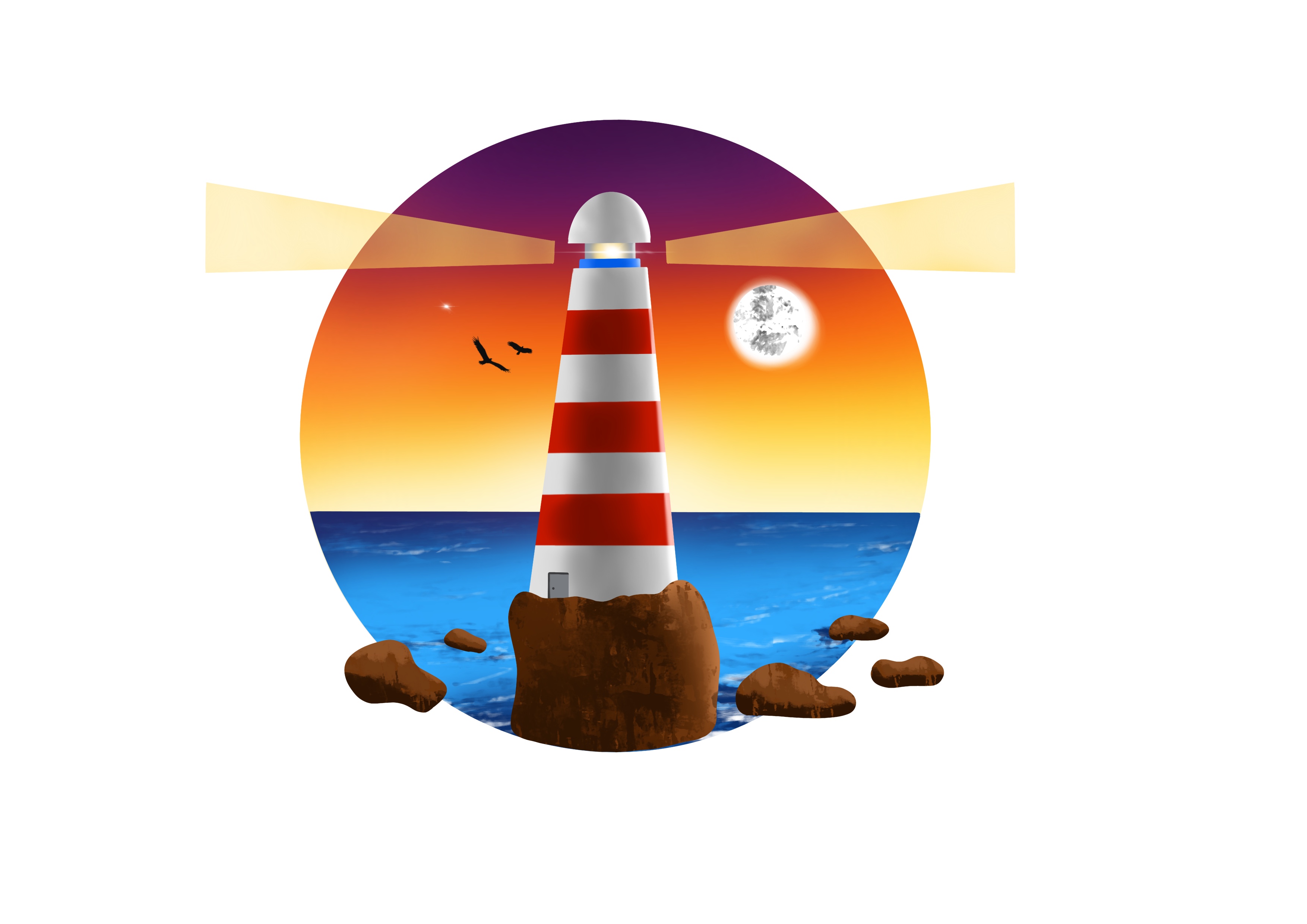 Lighthouse illustration. Drawing in Procreate on IPad and Apple Pencil. The romantic lighthouse was invented by my imagination. This illustration will remind you of the sea.