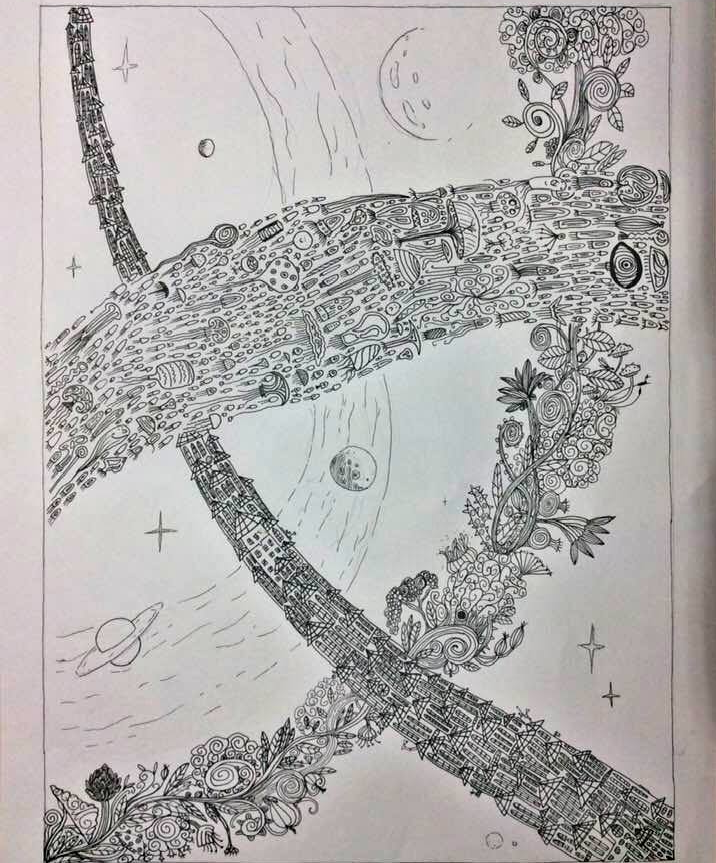 День и ночь, природа и урбанизация переплетаются в едином потоке, морские жители(фауна), цветы(флора) и башни, построеные человеком(урбанизация), и все в небе...