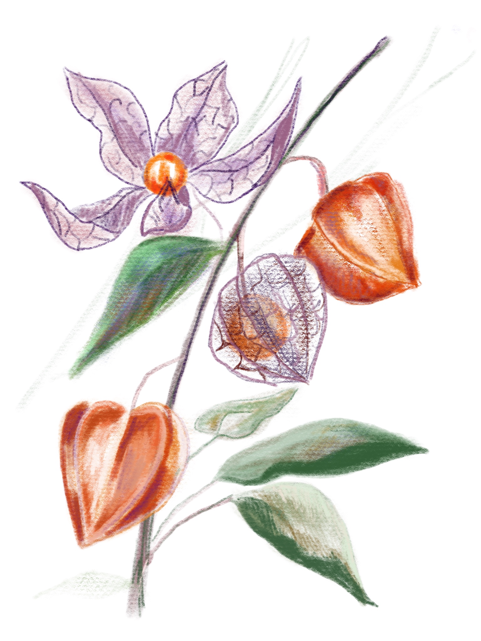 Ботанический скетч - цифровой рисунок пастелью . Изображён цветок и плоды физалиса . Нарисован на планшете IPad стилусом . Очень красиво !!!