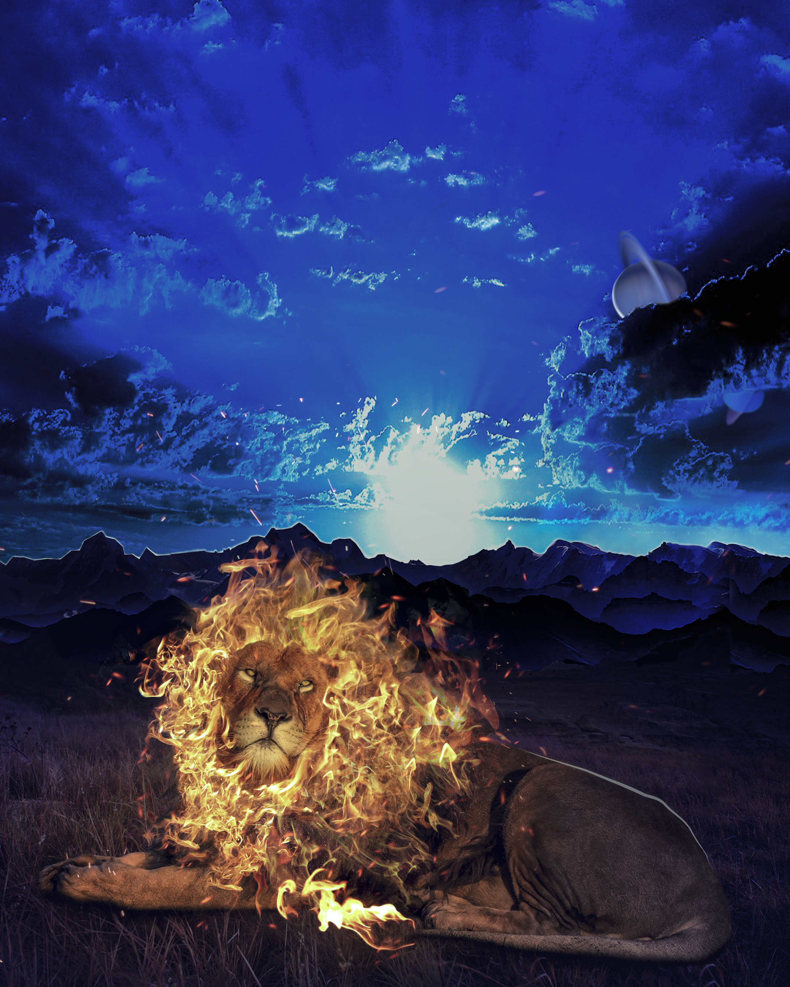 Огненный лев с красивым пейзажем для печати постеров, плакатов, открыток, календарей и другой полиграфии, а так же вашей фантазии в photoshop. Формат JPEG,RGB, размер 69х86 см или 2612х3267 пикселей.