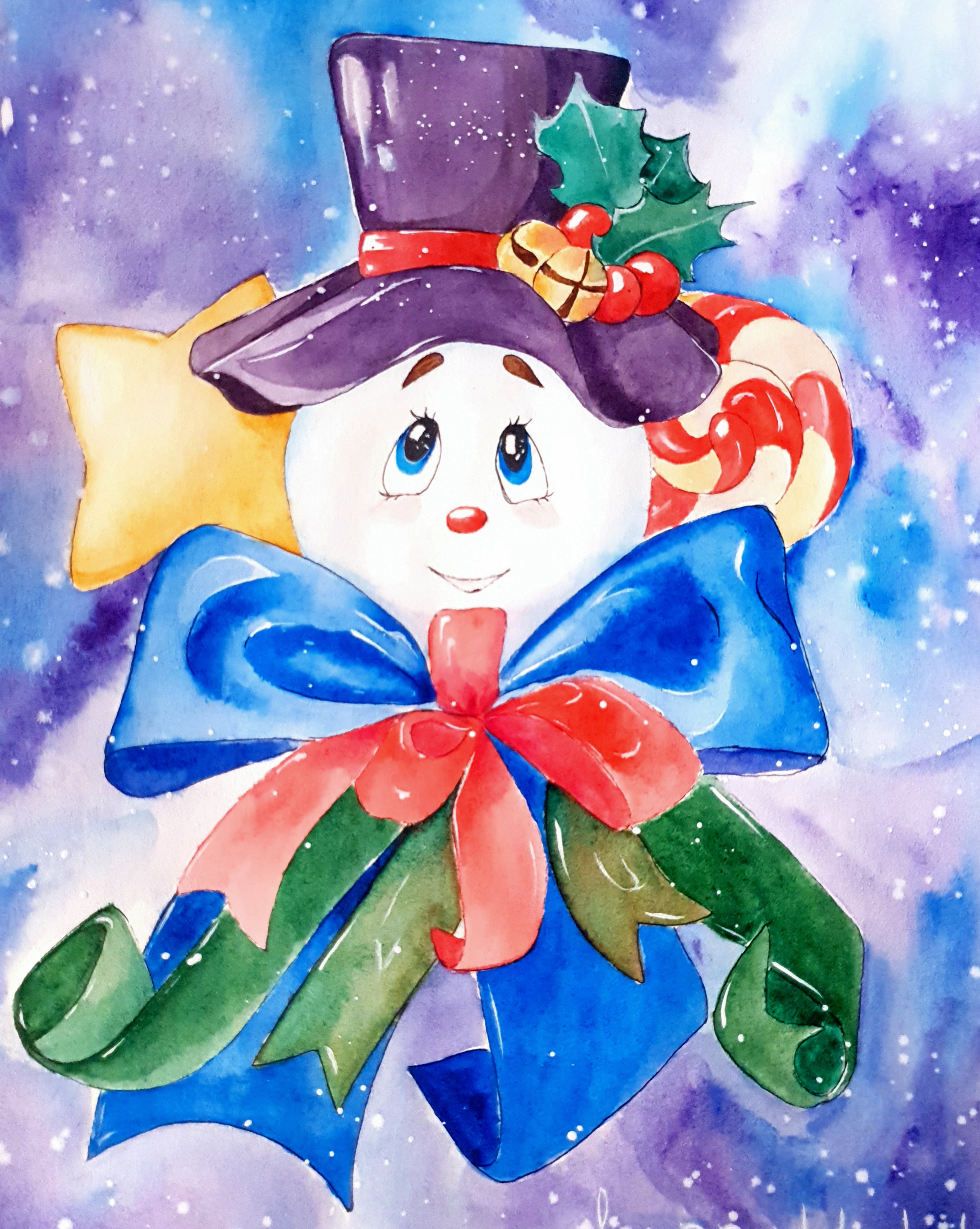 Очаровательный и нарядный снеговичек выполненный яркой акварелью на бумаге, уже в ожидании чудес и праздника. Иллюстрация для ярких праздничных открыток, подарков, принтов для игрушек и поделок.