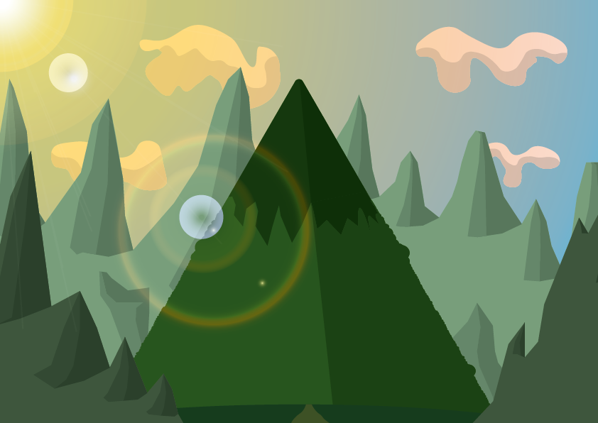 Небольшой примитивный пейзаж, изображающий горы в светлый летний день. Выполнен в векторной 2D графике, но создаёт впечатление пространства за счёт геометрической и воздушной перспективы.