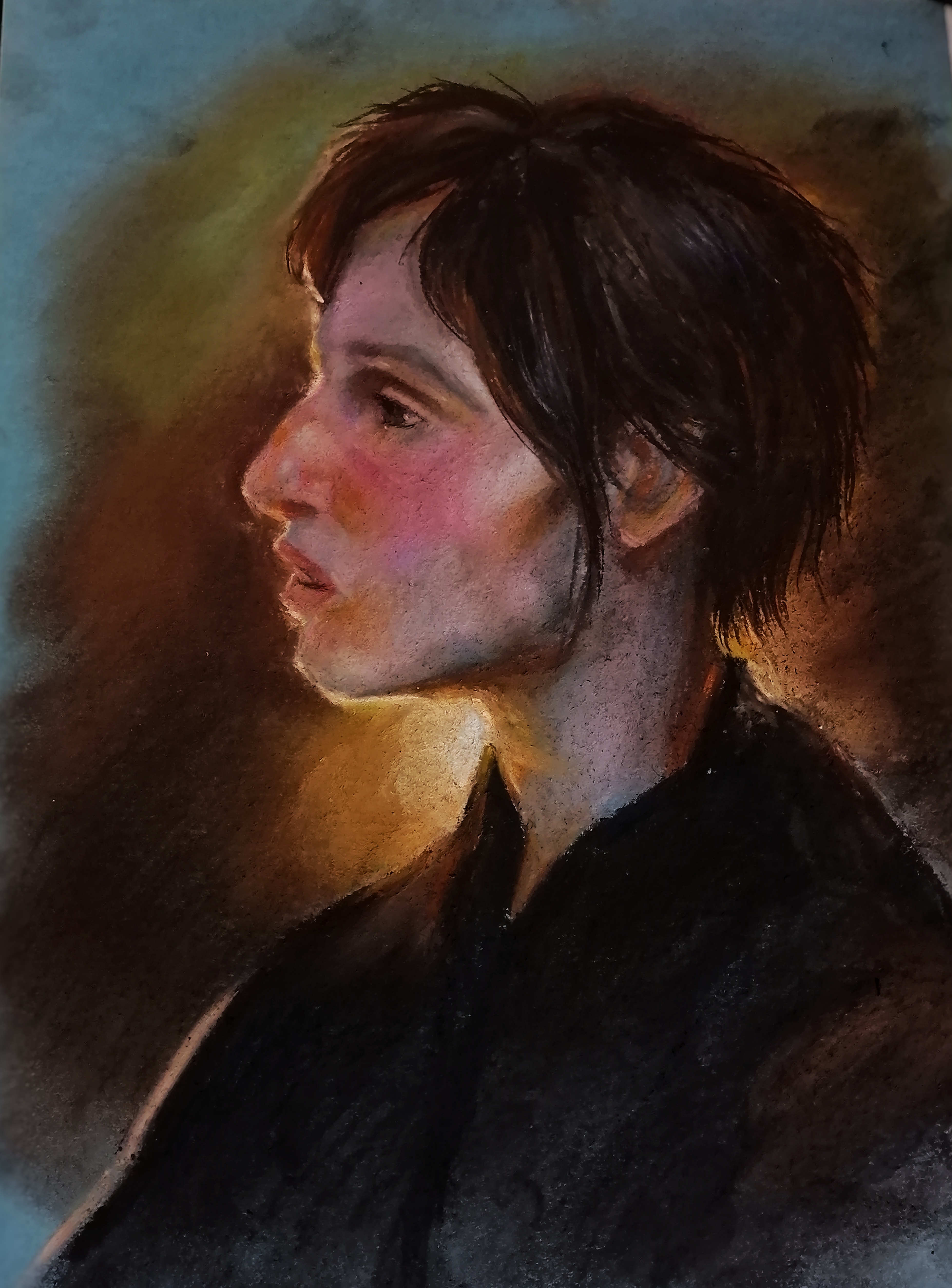 Создавался этот портрет в сложный и эмоциональный период моей жизни. И наверно именно работа над ним помогла мне прийти в себя. Работа выполнена сухой мягкой пастелью на а4 формате