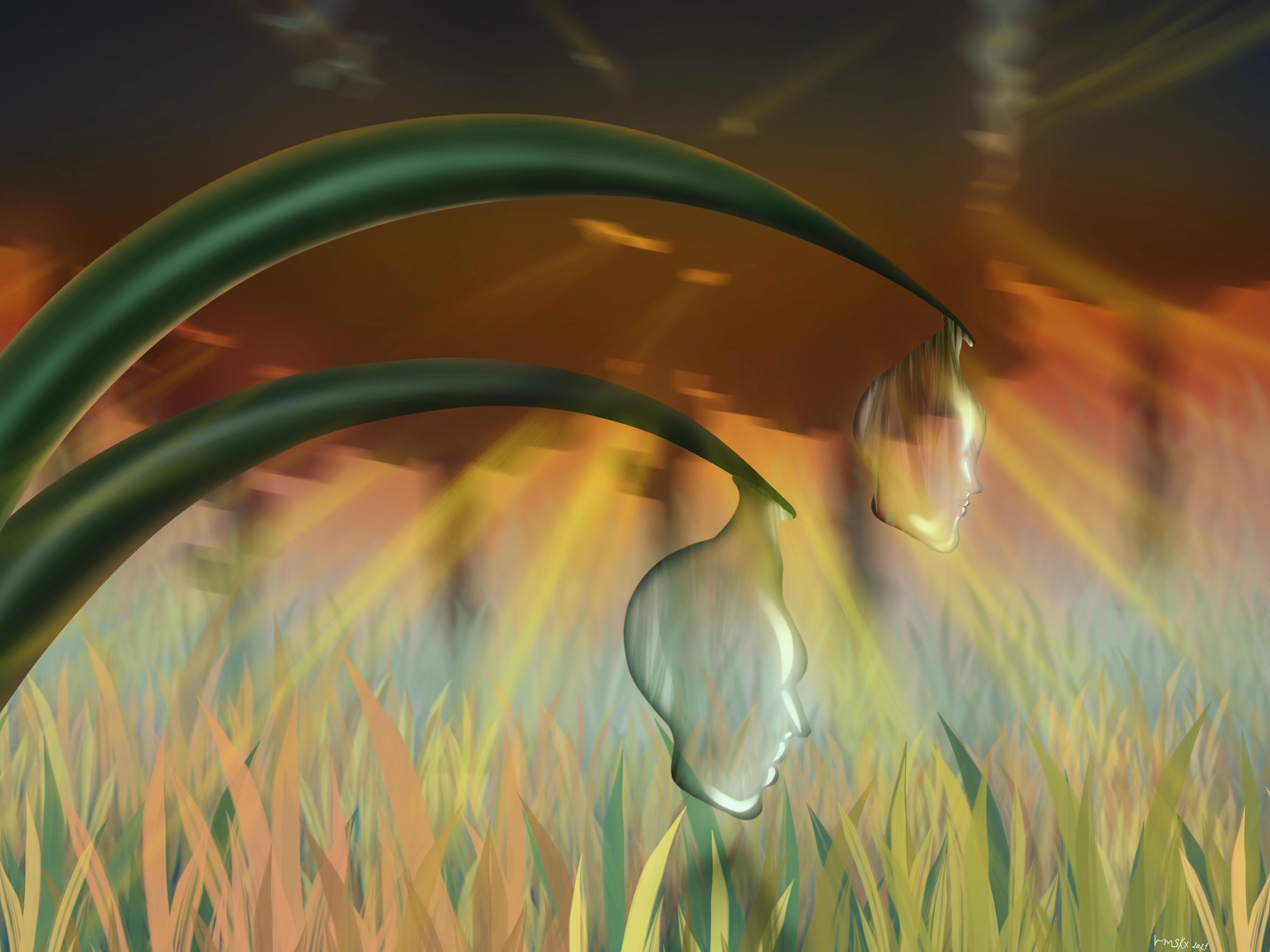 Иллюстрация утреннего поля с каплями росы в виде человеческих лиц,что свисает с травинок. Рассвет. Солнечные лучи пробиваются сквозь полосу леса.