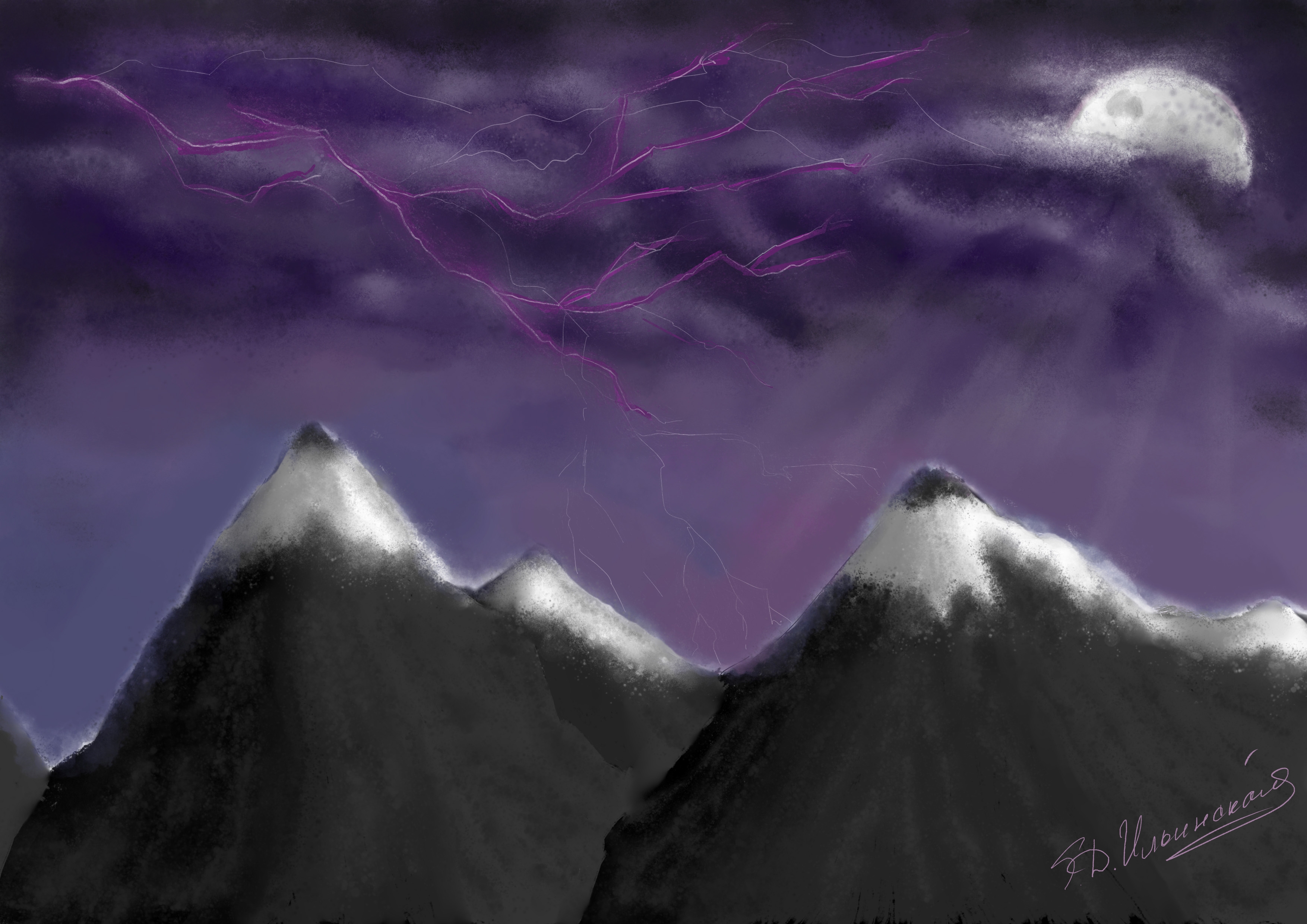 Горный пейзаж, погруженный во тьму грозы. Небольшая работа под грустное, возможно даже мрачное настроение. Выполнен арт на графическом планшете в специальном приложении.