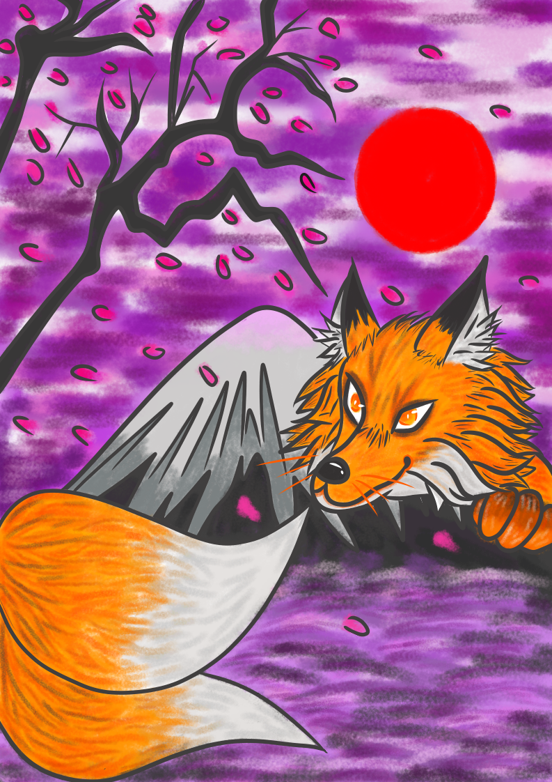 Работа выполнена в программе MediBang Paint. Изначально работа делалась на заказ, но в последний момент заказчик отказался брать. Первоначальная цена составляла 2000 рублей( цена предложена заказчиком). На изображении японский лис прячущийся и выглядывающий из-за горы Фудзи.