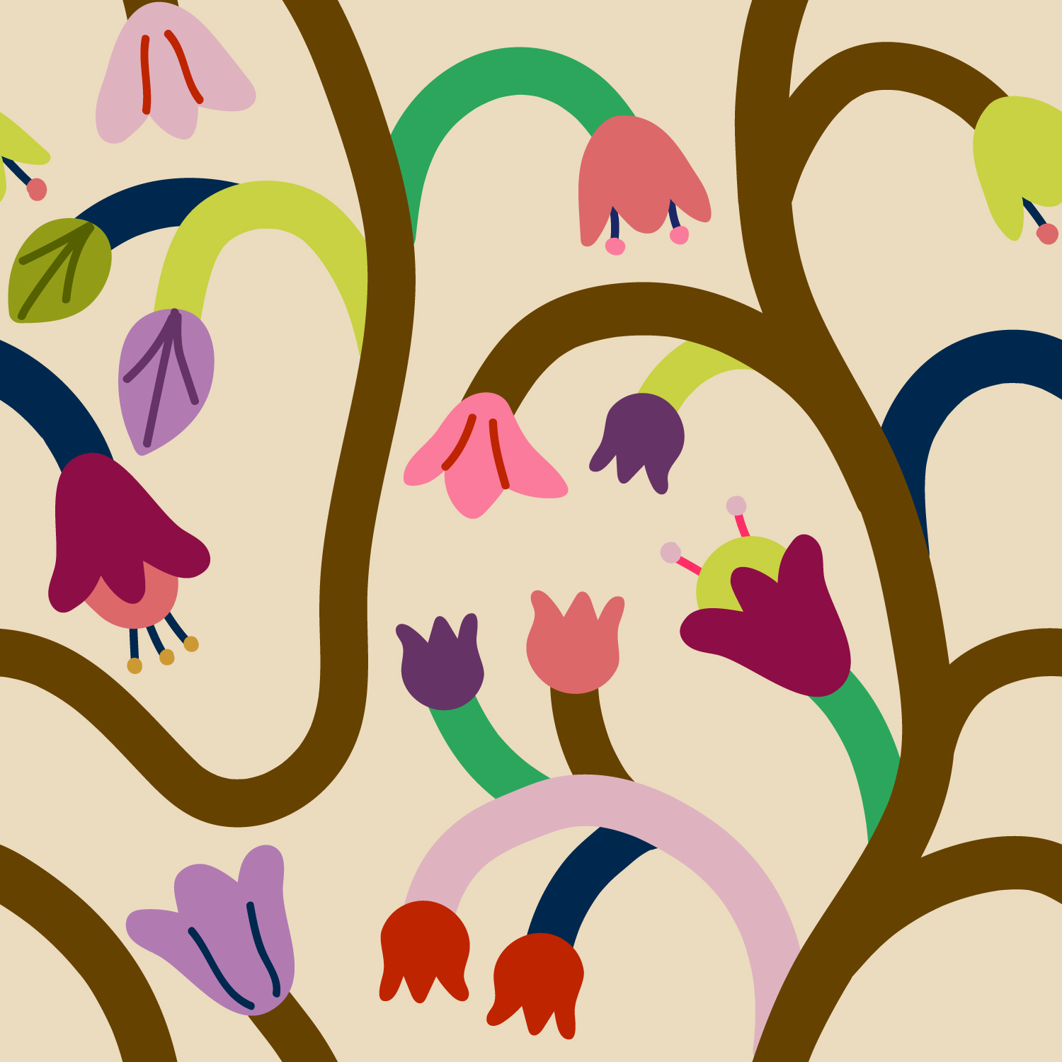 Бесшовный паттерн с милыми разноцветными декоративными цветами в наивном минималистичном стиле. Дизайн разрабатывался в первую очерень для обоев, но так же прекрасно смотрится на ткани, домашнем декоре, таком как - одеяла, шторы, подушки, плакаты и др.