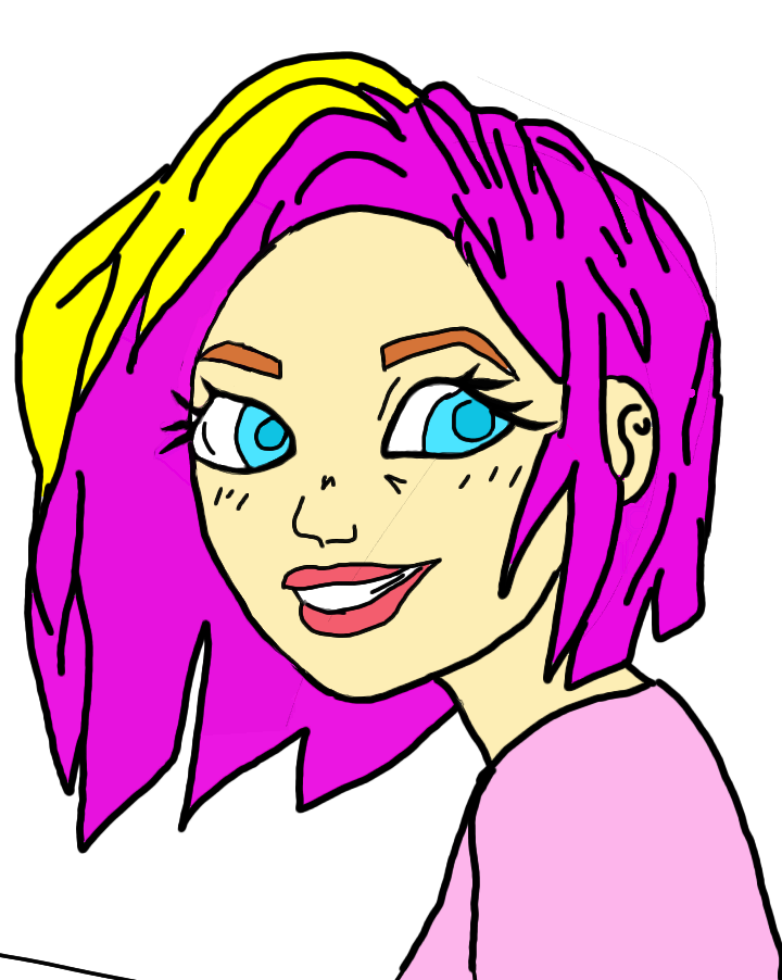Веселая девочка , смотрящая с влюблёнными глазами, у нее волосы фиалетого-желтые............................................................
