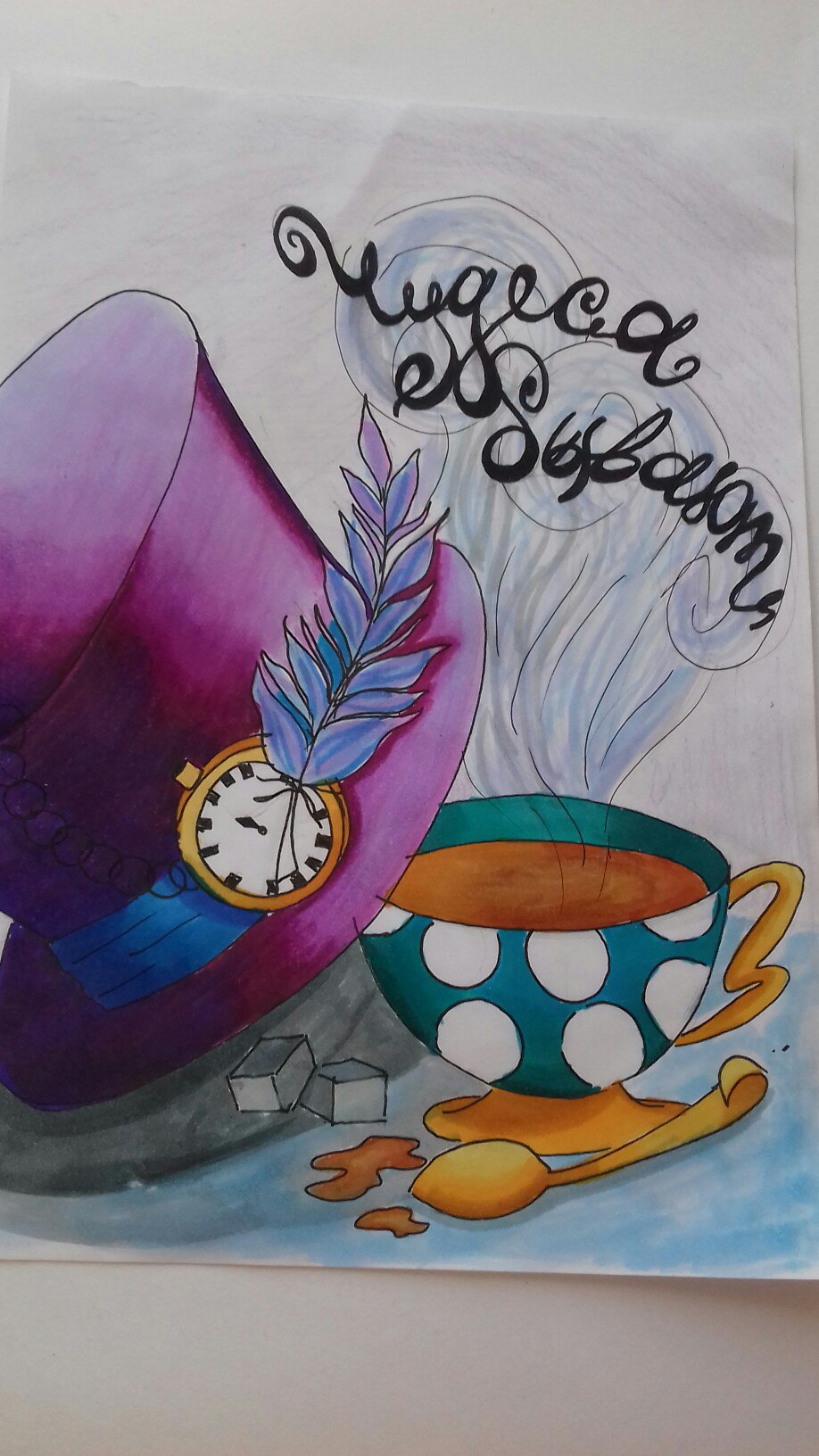 Рисунок выполнен маркерами для скечинга так же присутствуют акварельные карандаши. Формат листа А4 бумага специальная. Выполнено в стиле "Алиса в стране чудес"