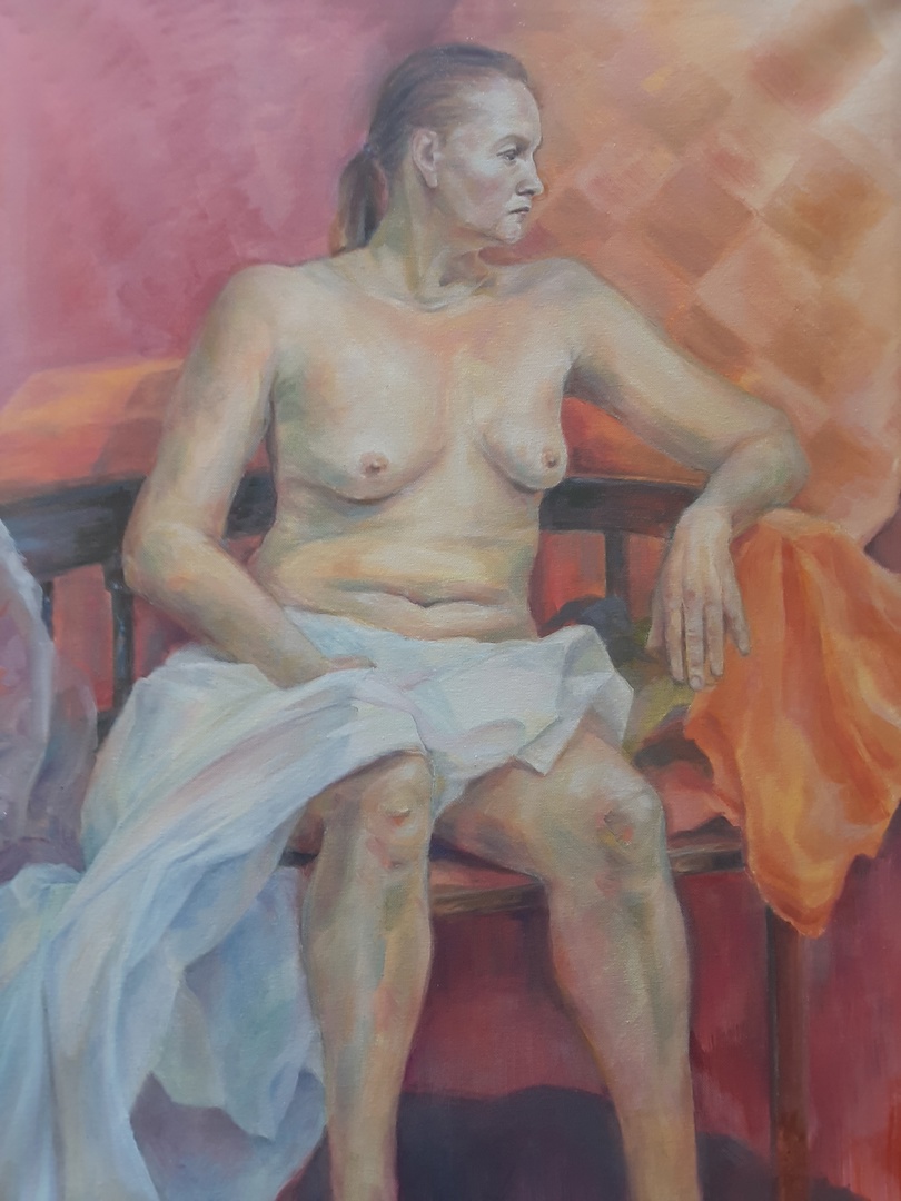Полуфигура человека. Написана масляными красками. На контрастном фоне. С использованием драпировок и мебели. Освещение боковое, естественное.