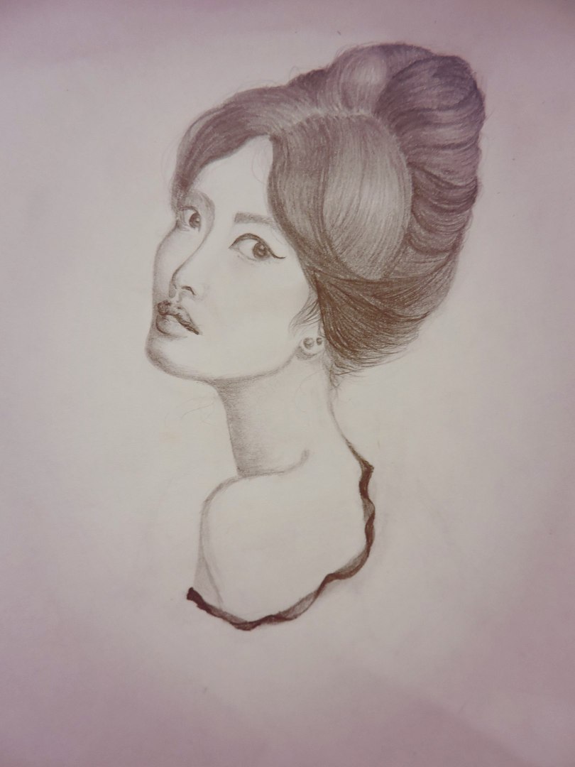 Прогуливаясь по улицам Акиты,я увидел прелестную девушку.Красавица стояла под древом сакуры и напевала нежную мелодию.Тогда я подошел ближе,чтобы познакомиться,но случайно оступился и чуть не упал.Она быстро обернулась на шум,посмотрев на меня именно так,как на картине, и я понял,что влюбился.Мы прожили вместе более семидесяти лет.И каждый день я испытывал чувство ,которое посетило меня в тот миг.