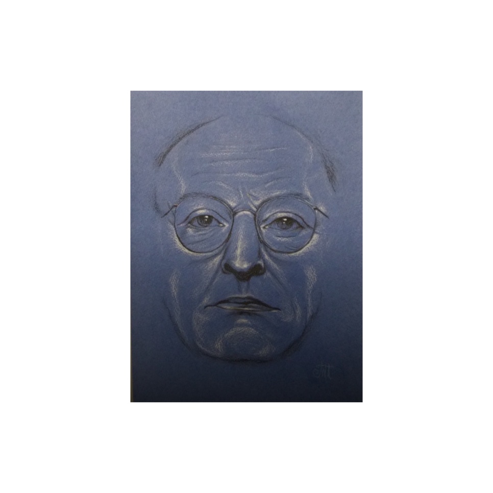 Портрет Иосифа Бродского. Формат А3. Оформление в оригинальном паспарту и тонкой тёмно-синий рамке. Материал: бумага для пастели, пастель, угольный карандаш.