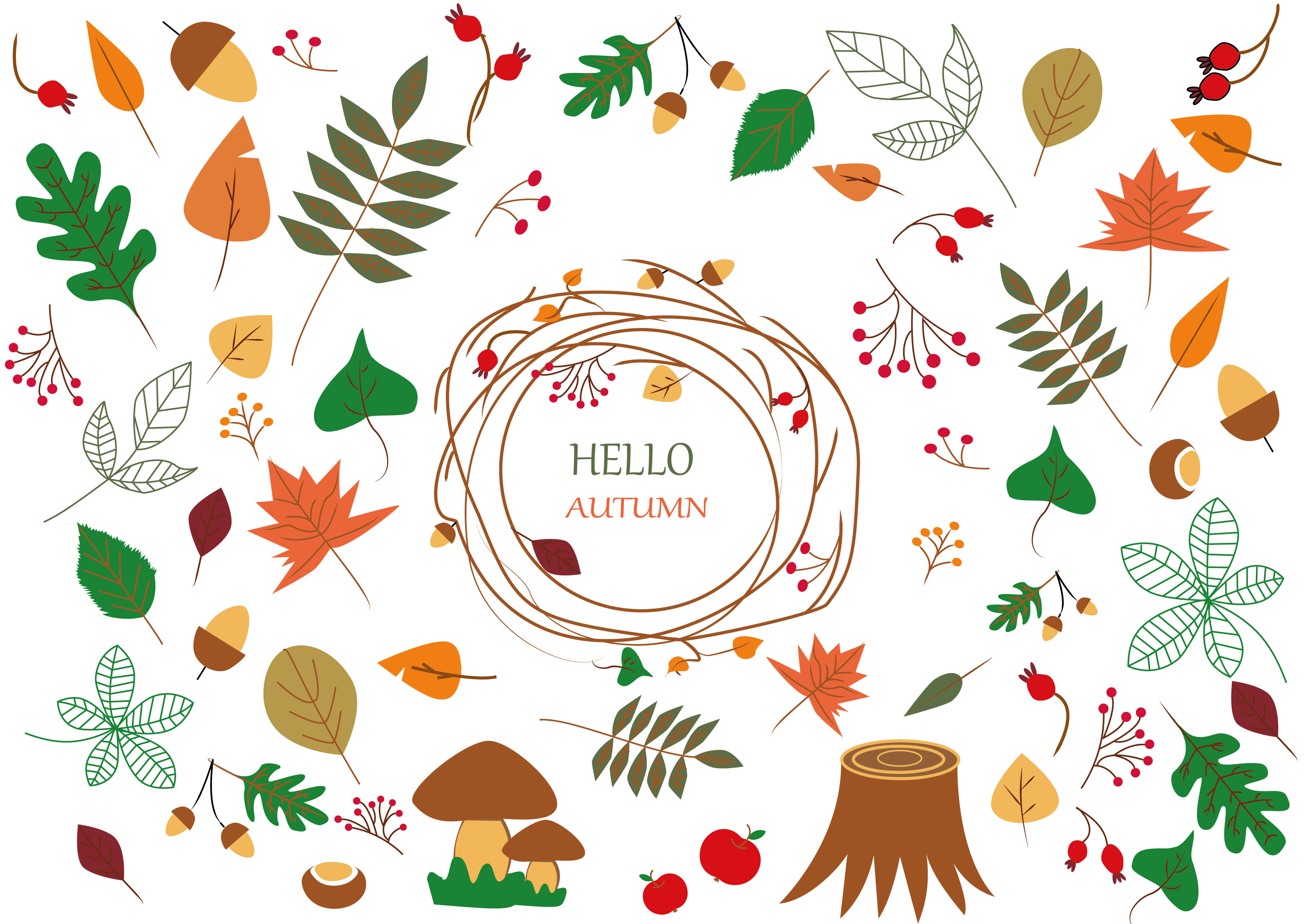 Иллюстрация, выполненная в векторной графике на тему осени. Может быть использована как осенний паттерн. На иллюстрации также изображены атрибуты осени.