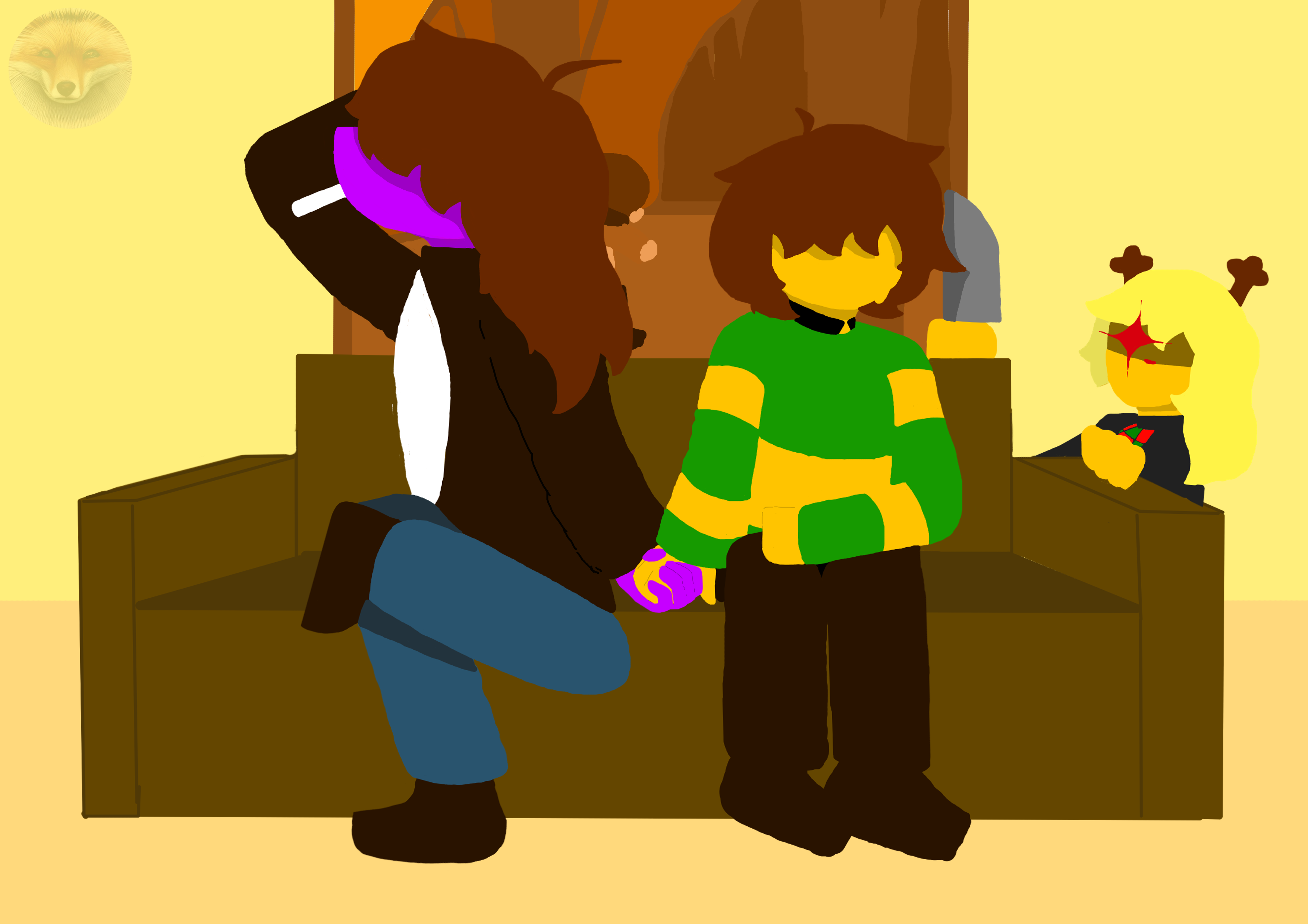 моя картина была нарисована 3 месяца назад рисовал при помощи мышки в крите персонажи из игры deltarun,Крис и Сьюзи держаться за руки на диване