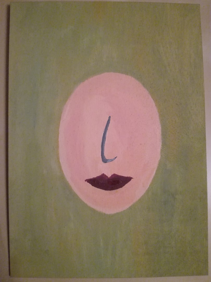Рисунок выполнен гуашью по дереву (21х29,5). Вдохновлен литературой постмодернизма и современным обществом, в котором - безликом - бордовые губы зачастую призываются, чтобы подчеркнуть "индивидуальность".