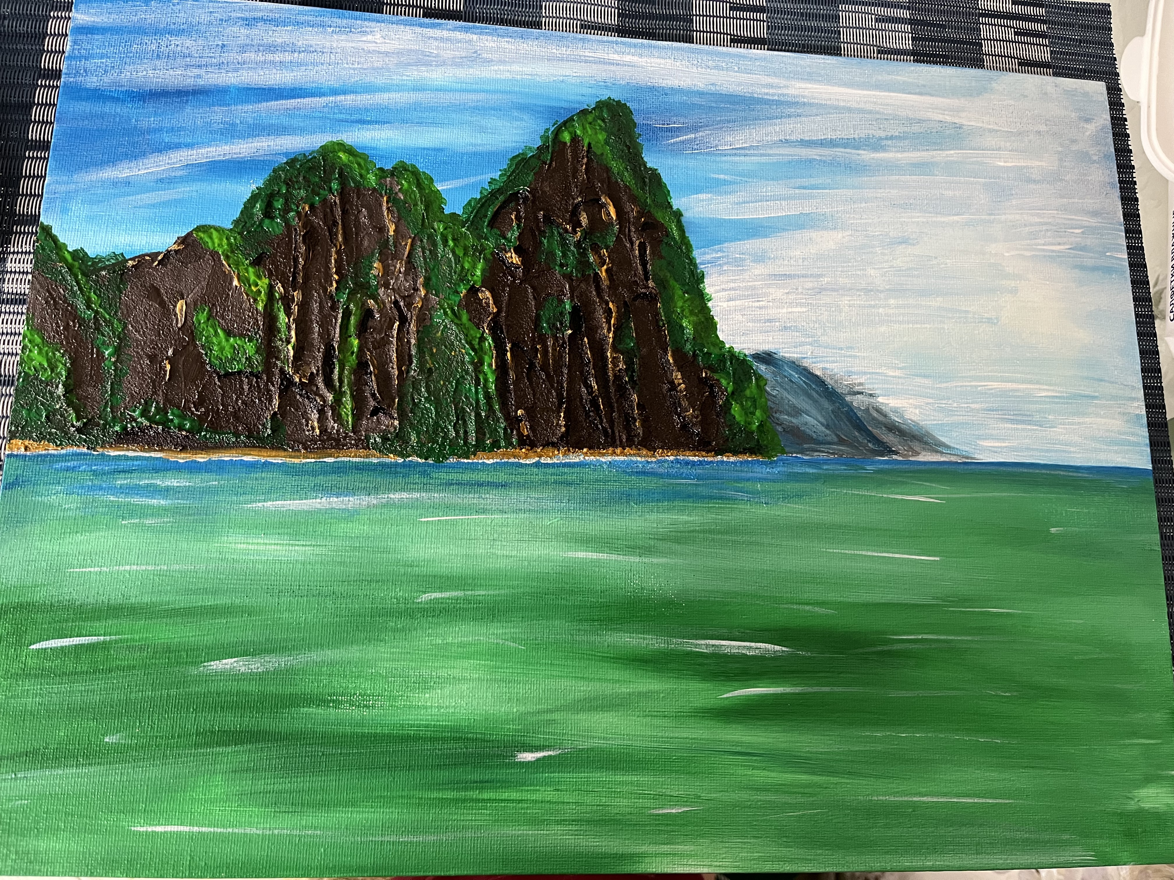 Изумительный Таиланд написана акрилом с использованием текстурной пасты, обратите внимание на скалы, которые выглядят объемно и массивно. Эта картина передает безупречный океан и красивые скалы. Глядя на неё становится тепло