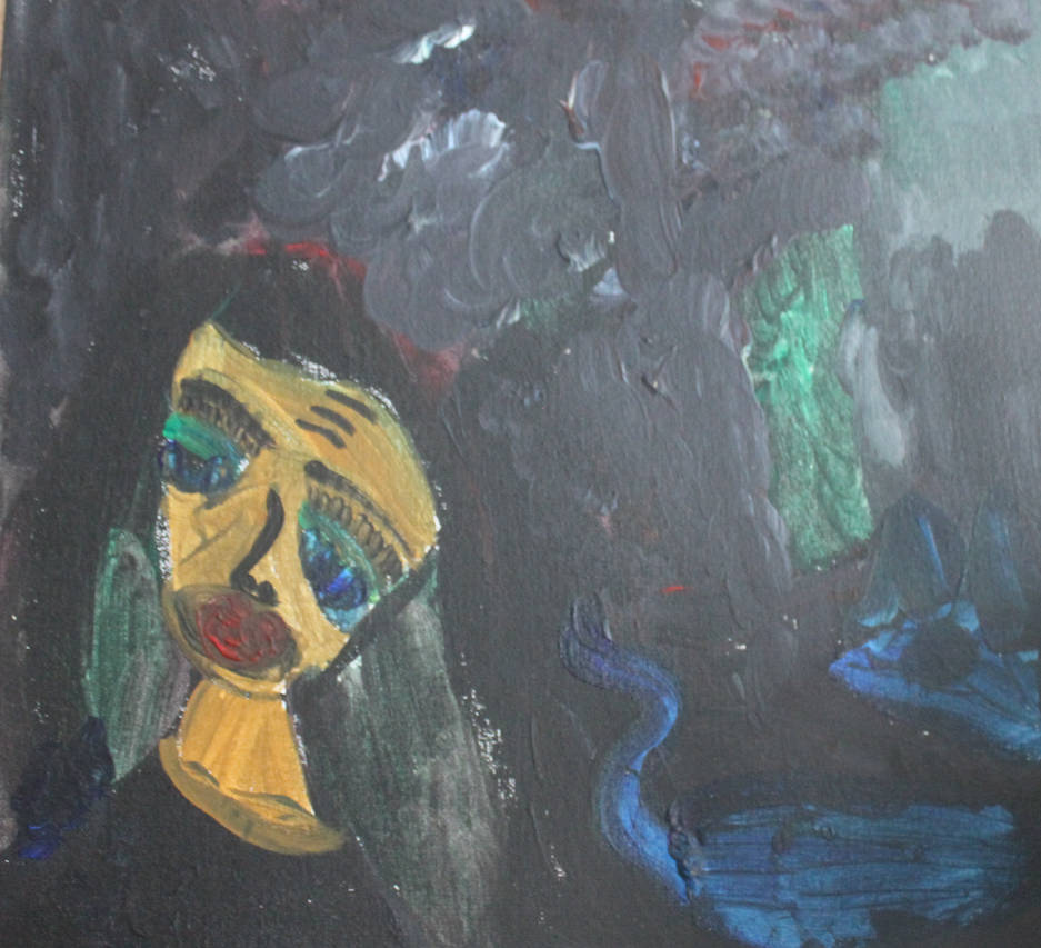 Ярка и интересная работа в жанре неоромантизма и немного авангарда, на холсте изображено лицо девушки, слегка изможденное и опечаленное. Картина находится в продаже