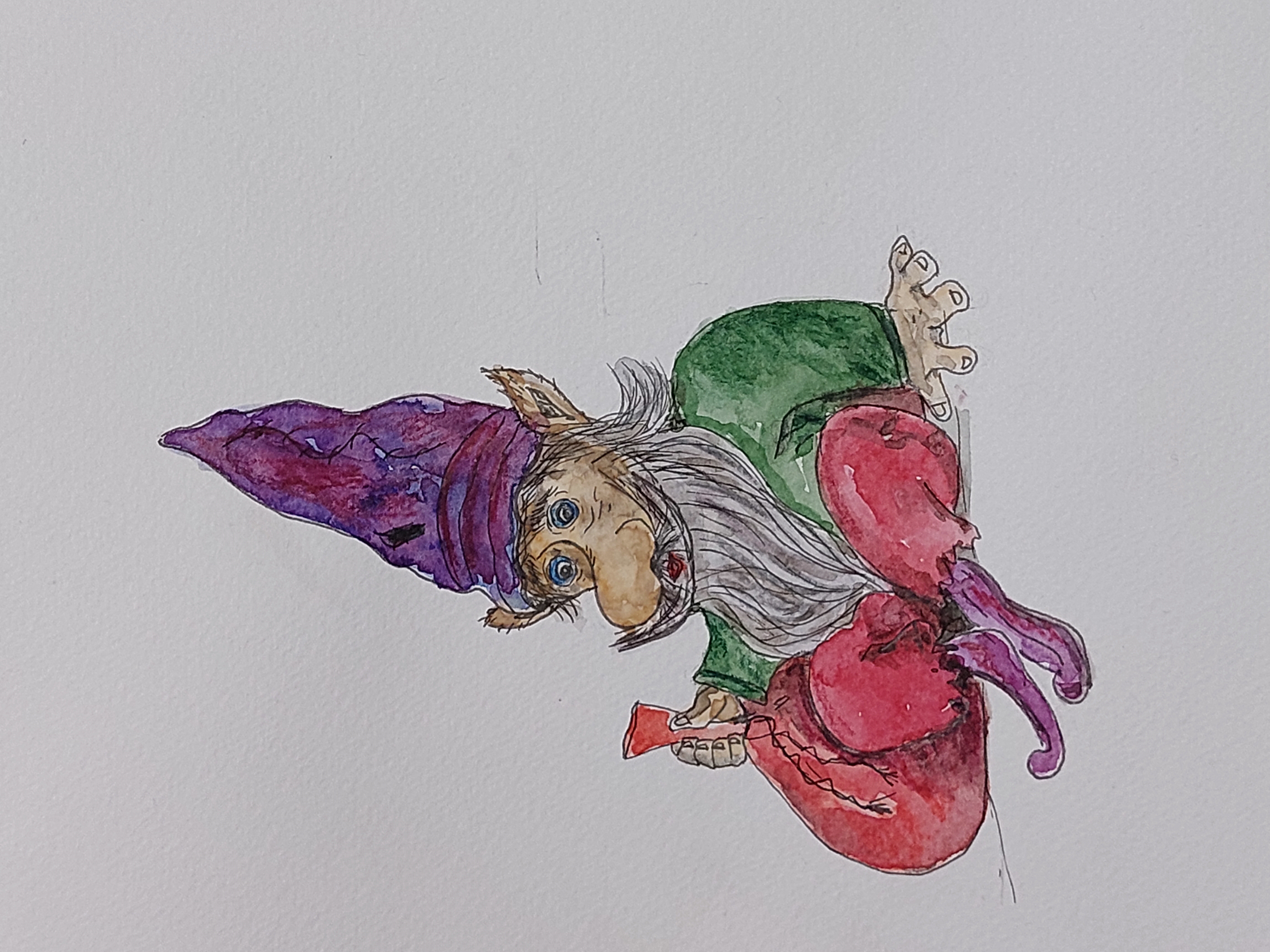 Старый гном сидит в высоком колпаке. Держит в руке красный мешок. Уши у гнома эльфийские. Гном грустный с длинной бородой. Одет в зелёный сюртук.