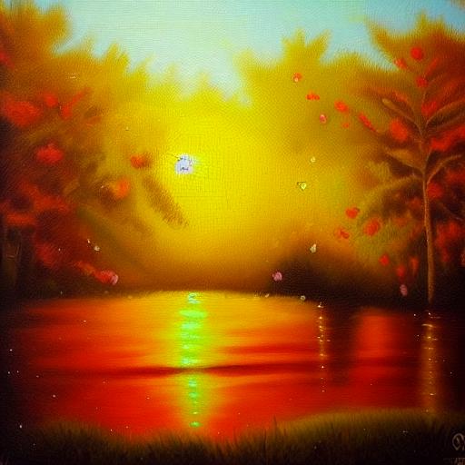 На картине изображены осенние деревья на озере, само озеро отражающее солнце.