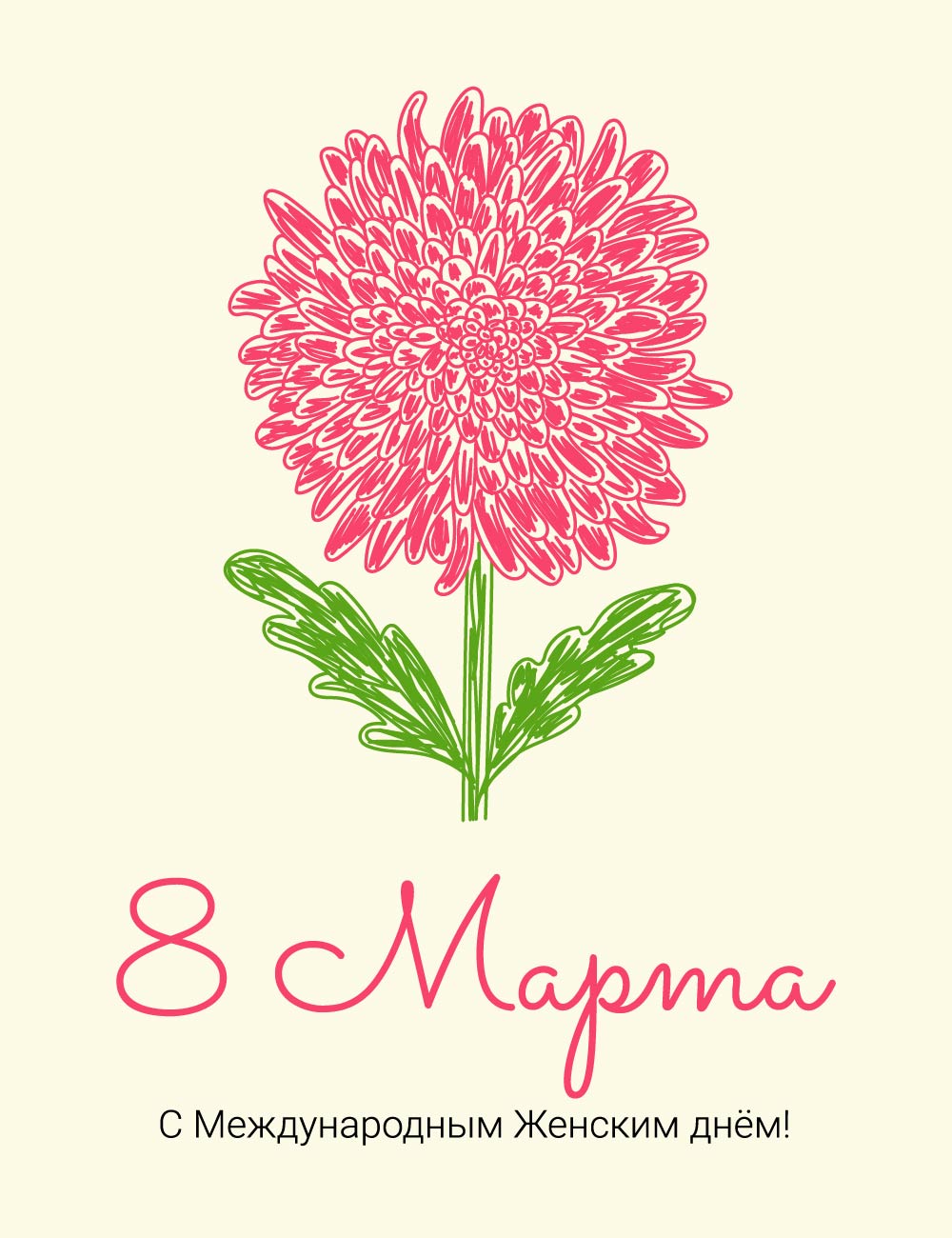 Цветок нарисованный в векторе в стиле маркера карандаша или цветной ручки. Открытка на 8 Марта. С Международным Женским днём. Розовая хризантема