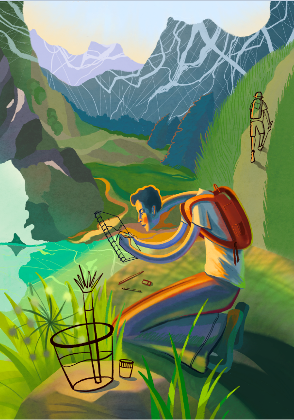 Работа вдохновлена поездкой в Приэльбрусье. Исследую ощущение пути, наблюдения и пластики тела через эксперимент с анатомией. Хотелось передать эту страсть передать на бумаге что-то очень красивое.